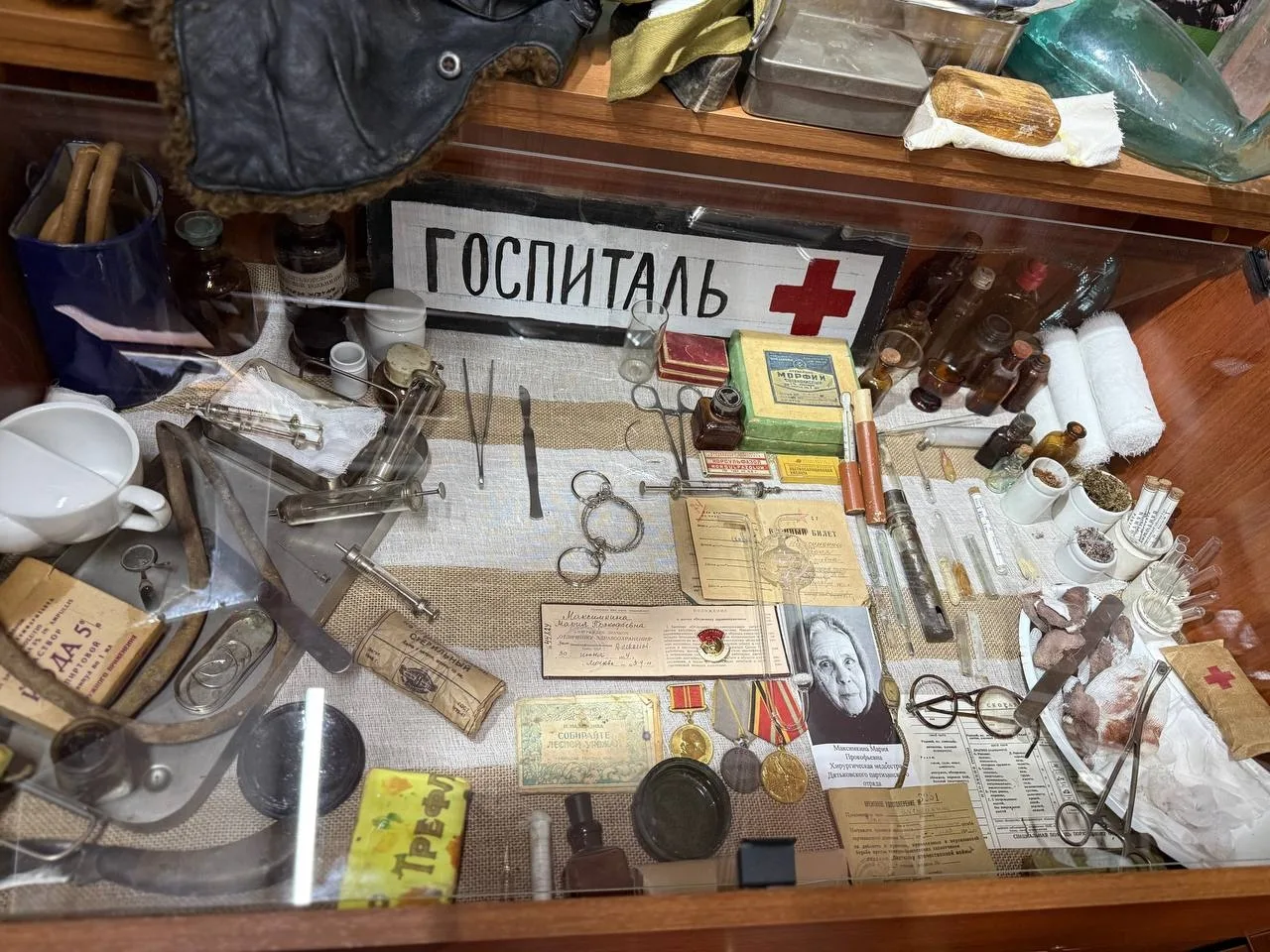 Нам показали настоящие хирургические инструменты, которые были огромной ценностью. Обычные пилы превращались в ампутационные, сапожные ножи, раскаленные на огне, становились скальпелями, а кухонные ножницы – незаменимыми помощниками. Когда не хватало хирургических игл, в ход шли швейные, а нити добывали из белья. Часто это были пинцеты, скальпели, зажимы, принесённые из гражданской жизни или добытые в бою. При отсутствии антибиотиков и перевязочных материалов медики использовали народные средства: отвары коры дуба вместо йода, а мох сфагнум – как природный антисептик.