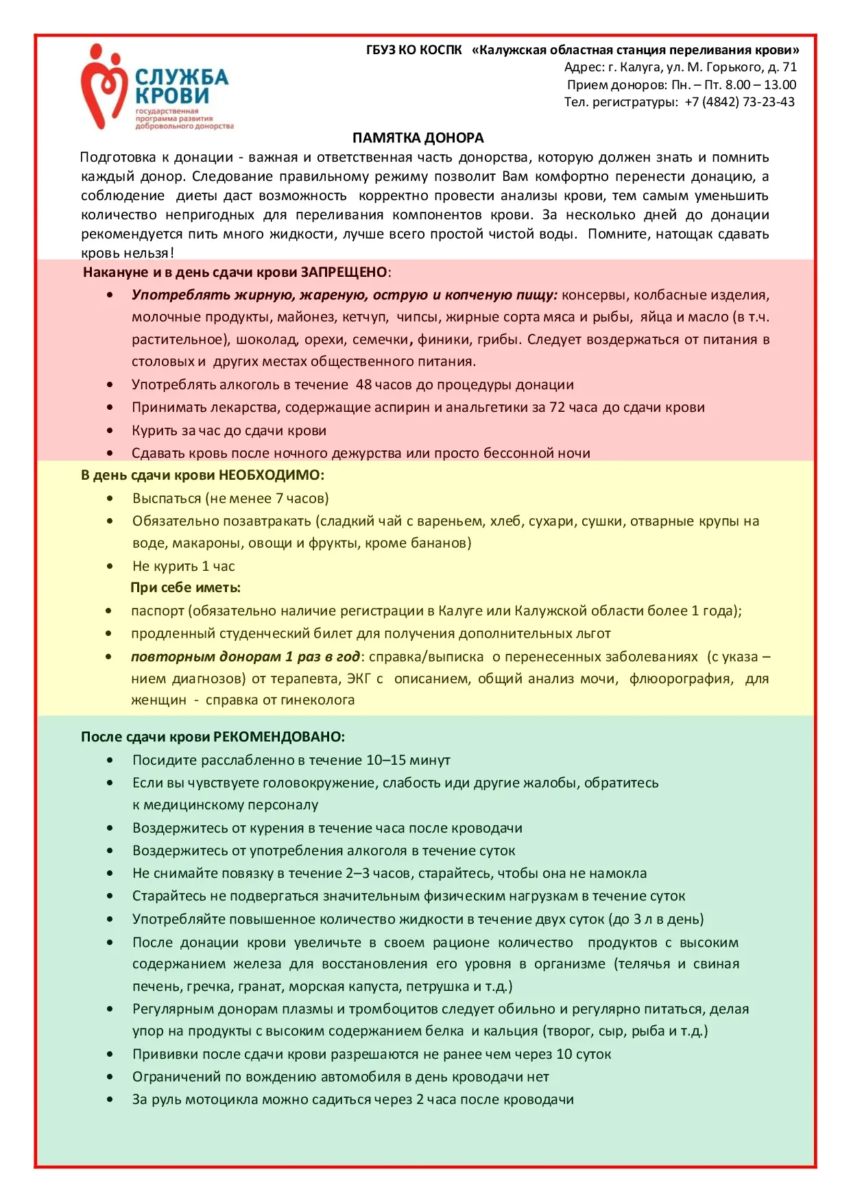 Министерство природных ресурсов и экологии Калужской области и ГБУЗ КО «Калужская областная станция переливания крови» 23 апреля 2026 года с 8.30 до 12.00 проводит совместную акцию «День донора».