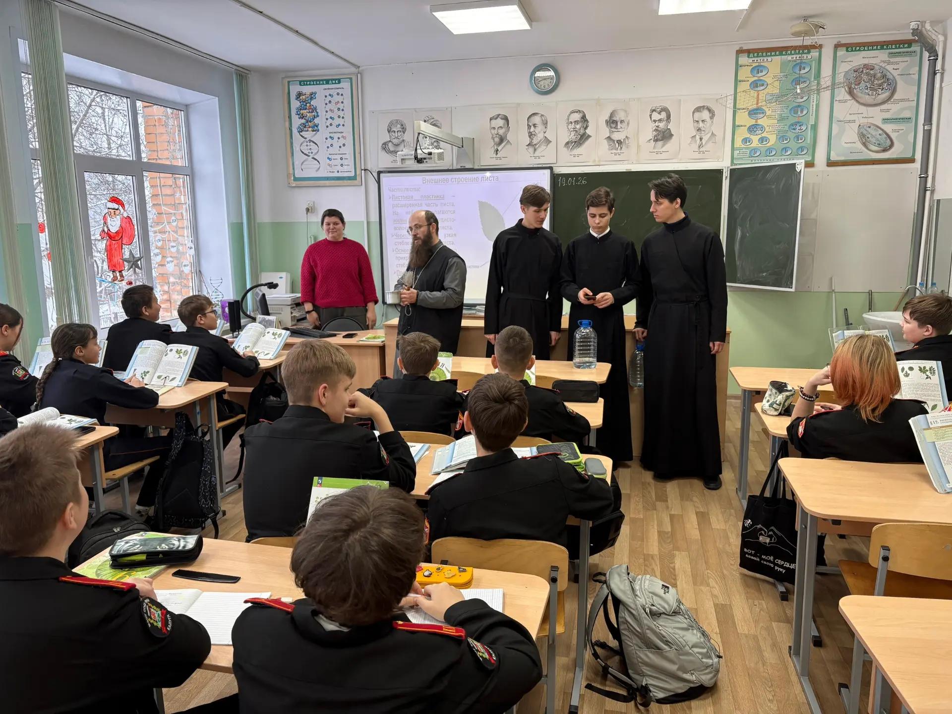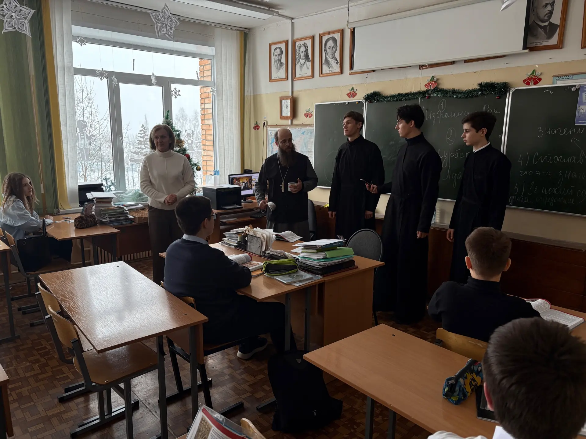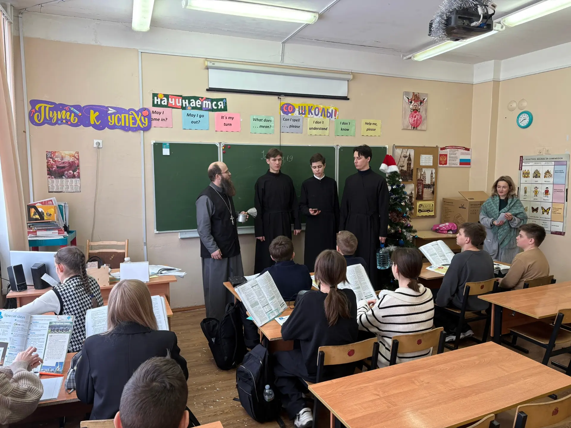 19 января в нашей школе прошла интересная встреча учащихся с клириком храма в честь Феодоровской иконы Божией Матери отцом Ильей и студентами Калужской духовной семинарии. Гости поздравили ребят с праздником Крещения Господня, спели праздничные колядки и пожелали учащимися крепкого здоровья, счастья и благополучия. Они также выразили надежду, что каждый из ребят найдет свой путь в жизни, наполненный смыслом и добрыми делами. Кроме того, были высказаны пожелания о том, чтобы молодое поколение сохраняло и приумножало традиции своей семьи и страны, обретая духовную силу и мудрость. Такое взаимодействие между школой и церковью помогает укрепить духовные ценности у молодежи, развивает чувства патриотизма и любви к родным традициям. Надеемся, что такие мероприятия будут продолжаться и впредь!