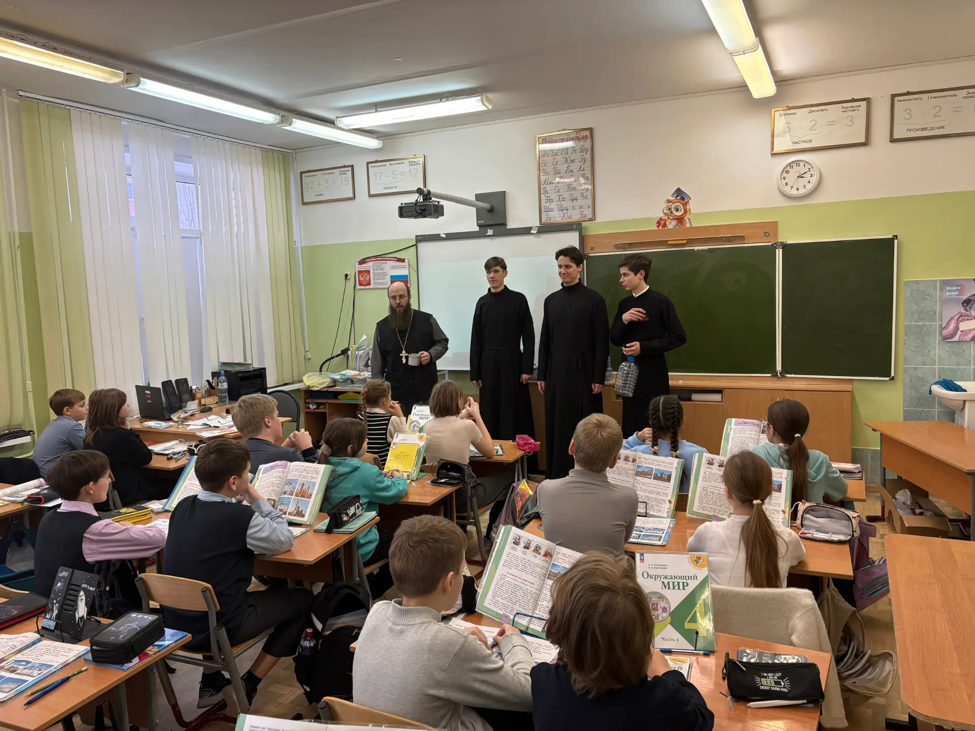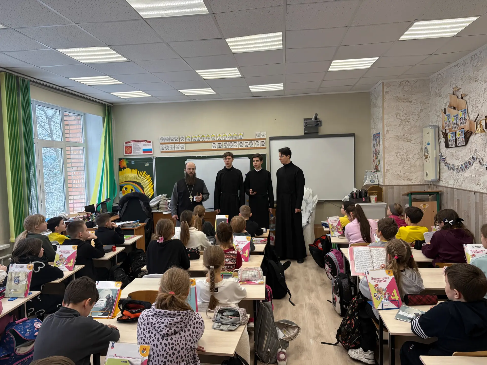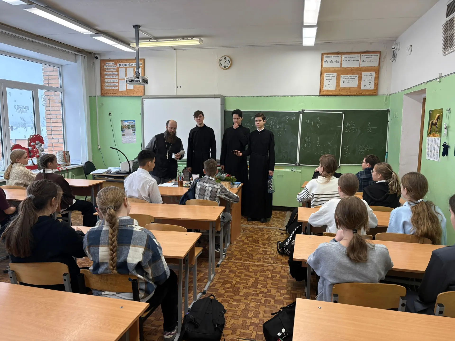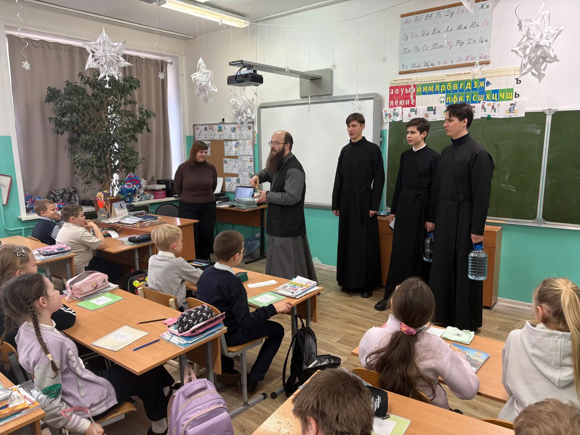 19 января в нашей школе прошла интересная встреча учащихся с клириком храма в честь Феодоровской иконы Божией Матери отцом Ильей и студентами Калужской духовной семинарии. Гости поздравили ребят с праздником Крещения Господня, спели праздничные колядки и пожелали учащимися крепкого здоровья, счастья и благополучия. Они также выразили надежду, что каждый из ребят найдет свой путь в жизни, наполненный смыслом и добрыми делами. Кроме того, были высказаны пожелания о том, чтобы молодое поколение сохраняло и приумножало традиции своей семьи и страны, обретая духовную силу и мудрость. Такое взаимодействие между школой и церковью помогает укрепить духовные ценности у молодежи, развивает чувства патриотизма и любви к родным традициям. Надеемся, что такие мероприятия будут продолжаться и впредь!