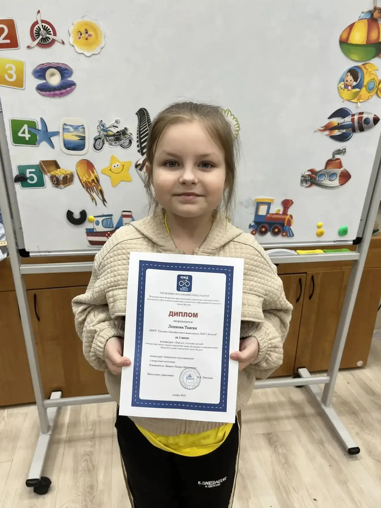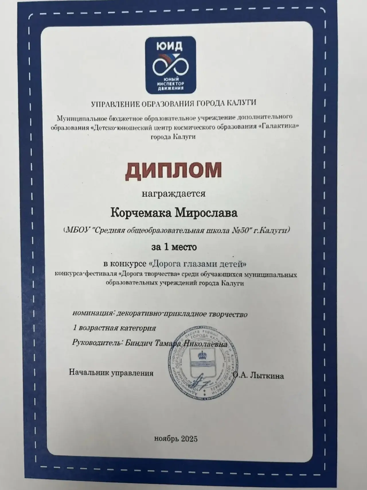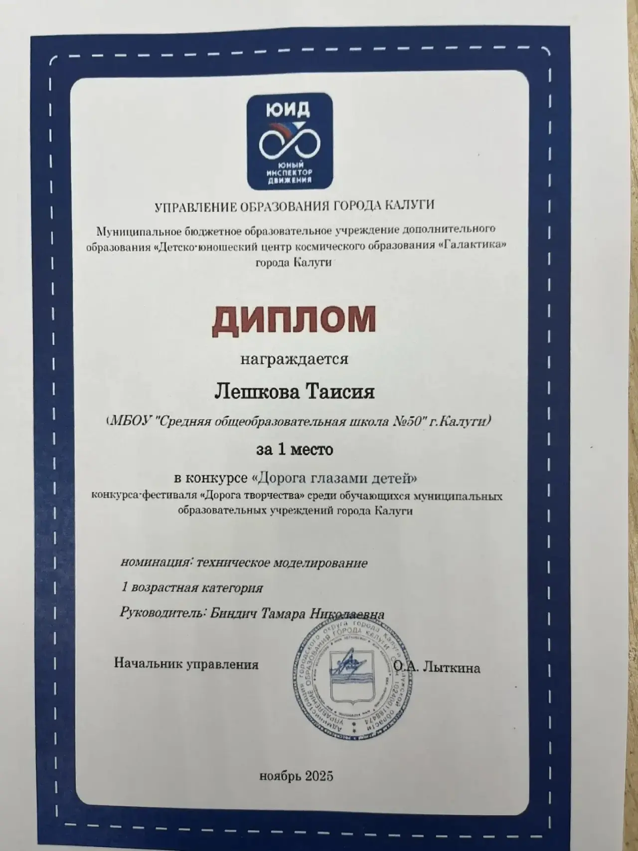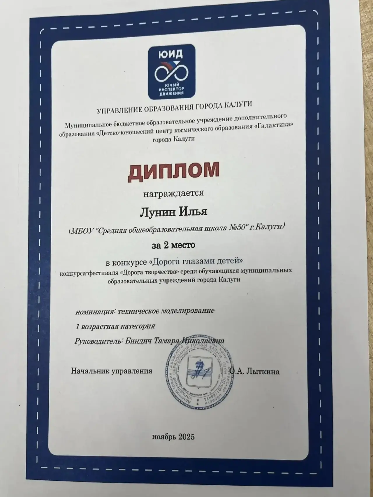 Подведены итоги областного заочного конкурса детского творчества «Дорога глазами детей 2025 год». Ежегодно этот конкурс организуется с целью активизации деятельности образовательных учреждений по обучению детей правилам безопасного поведения на дорогах и профилактике детского дорожно-транспортного травматизма, а также повышения уровня подготовки обучающихся общеобразовательных учреждений в области безопасности дорожного движения. Всего в конкурсе приняли участие более 200 обучающихся из 18 муниципальных районов Калужской области. Поздравляем Лешкову Т. с получением диплома первой степени и Лунина И. с получением диплома за второе место в номинации «Техническое моделирование»! Поздравляем Горлова А. с получением диплома за первое место в номинации «Социальный видеоролик»! Поздравляем Корчемаку М. с получением диплома за первое место в номинации «Творческое проектирование»!