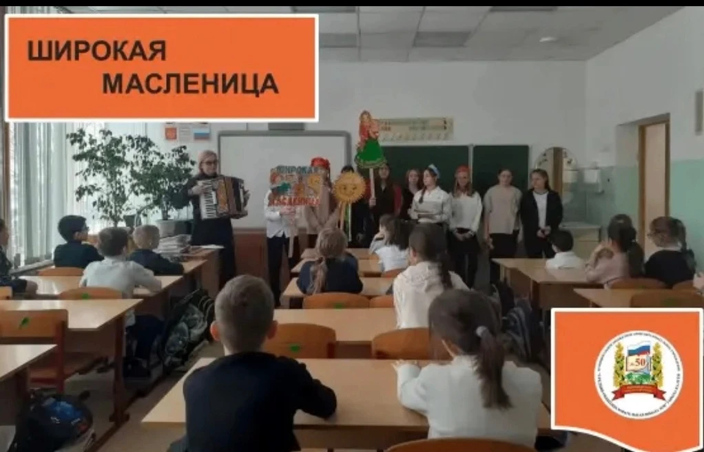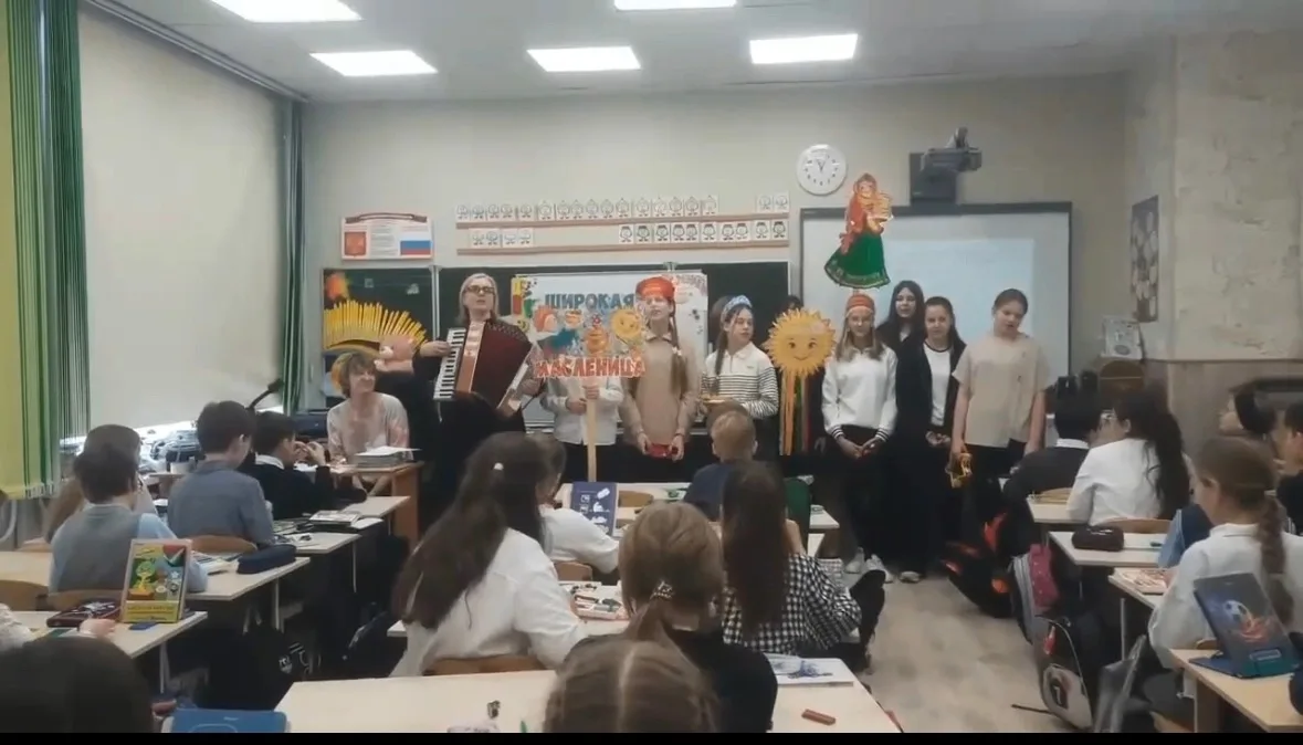 На масленичной неделе учащиеся 6 «Г» и 6 кадетского класса под руководством учителя музыки Финашовой Л. И. поздравили педагогов и учеников школы с праздником Широкой Масленицы.