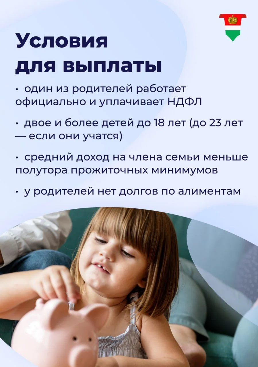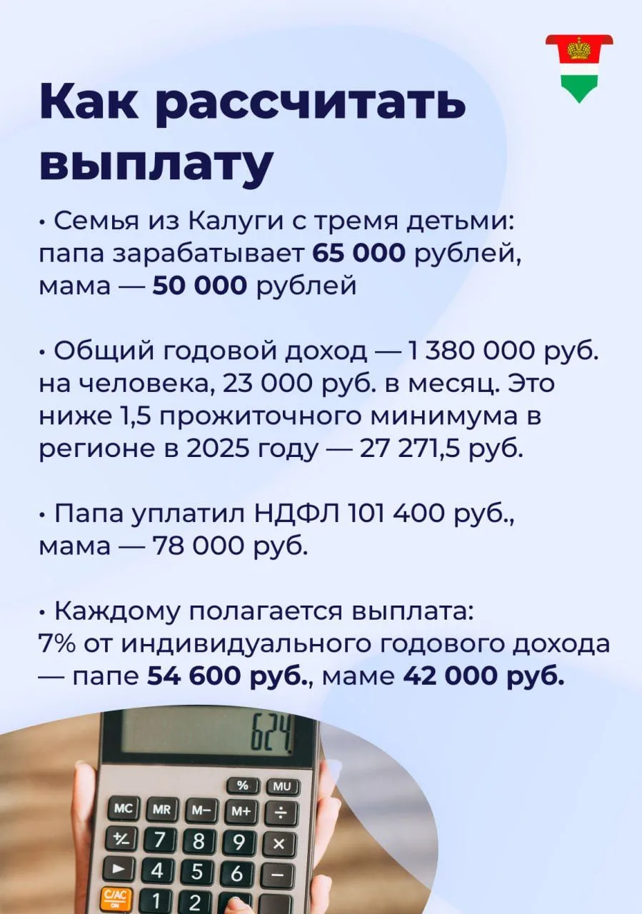 В конце прошлого года Владимир Путин анонсировал новую меру поддержки семей с двумя и более детьми. Теперь они смогут вернуть часть НДФЛ за предыдущий год. Главное условие: средний доход на члена семьи — меньше 1,5 прожиточных минимумов.