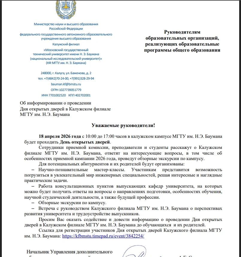 18 апреля с 10:00 до 17:00 Калужский кампус МГТУ им. Баумана вновь открывает двери для абитуриентов.