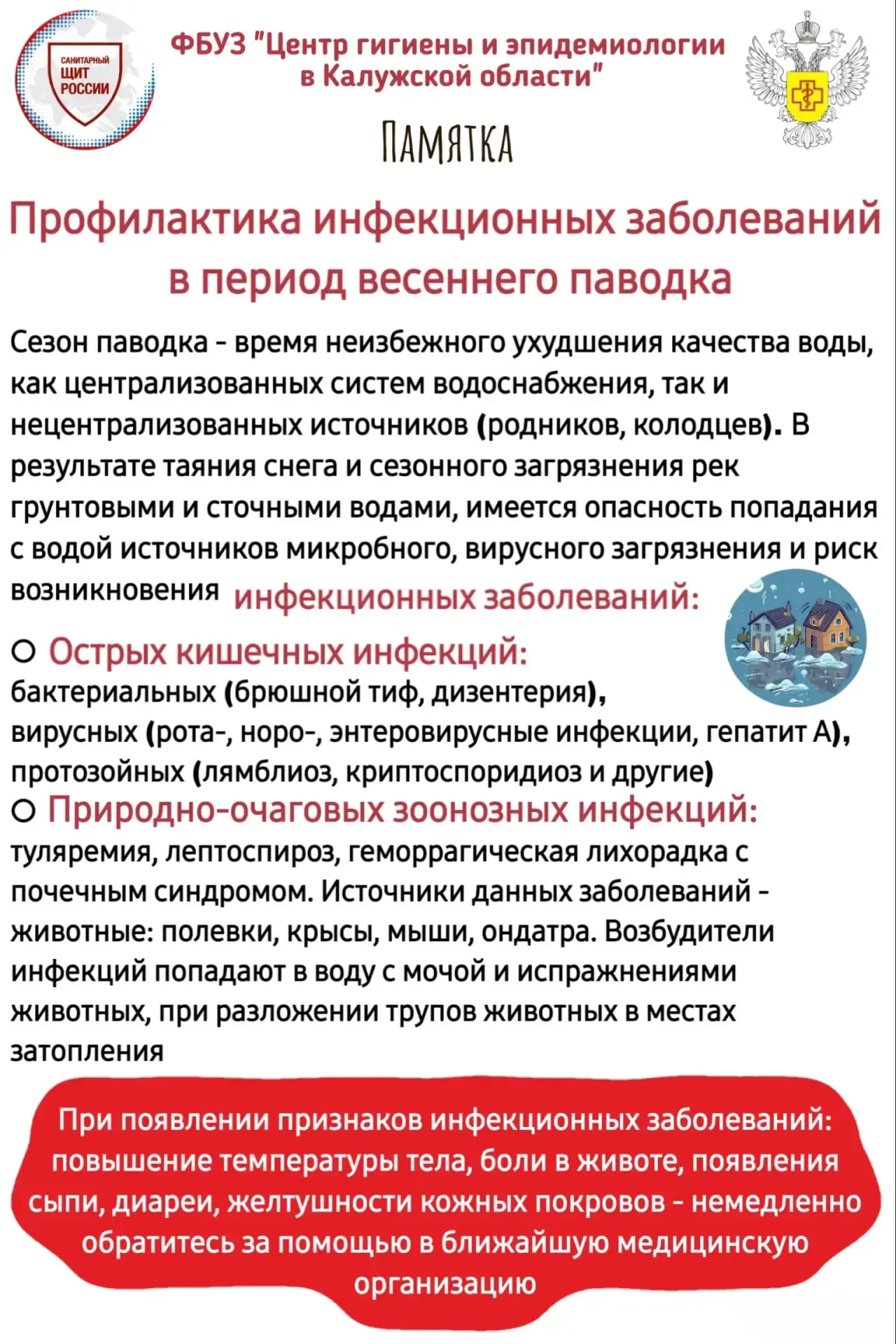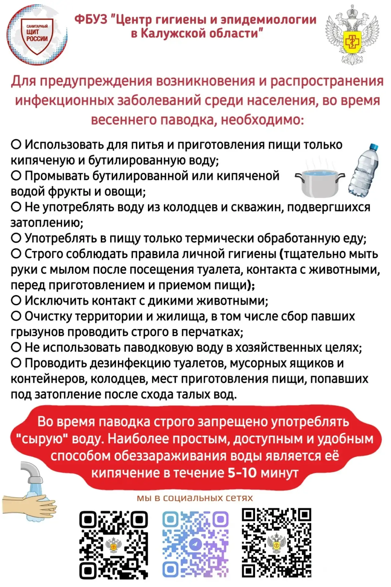 💦В период таяния снега и паводка возрастает риск загрязнения источников водоснабжения и территорий болезнетворными микроорганизмами.