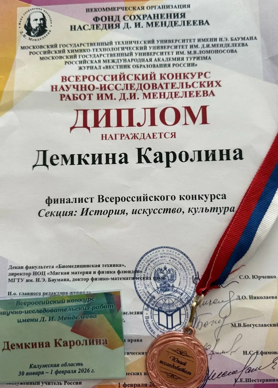 В столице Калугу представляли 14 победителей и призеров XII муниципального конкурса научно-исследовательских работ им. Д. И. Менделеева, среди которых наша Каролина Демкина, ученица 10 "А" класса.