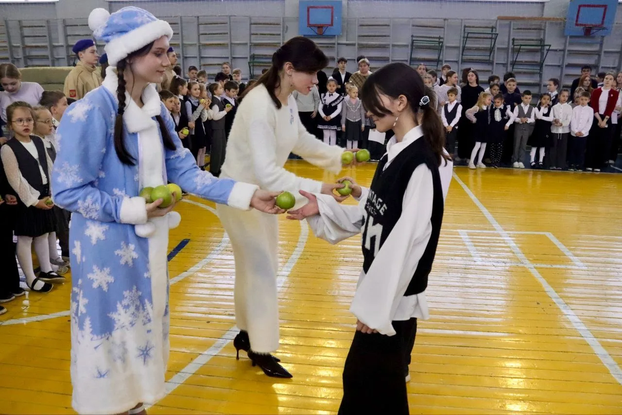 Особо были отмечены ученики, которые продемонстрировали образцовую посещаемость – им директор школы Гаврикова Алена Анатольевна и Снегурочка вручили символичные зеленые яблоки🍏