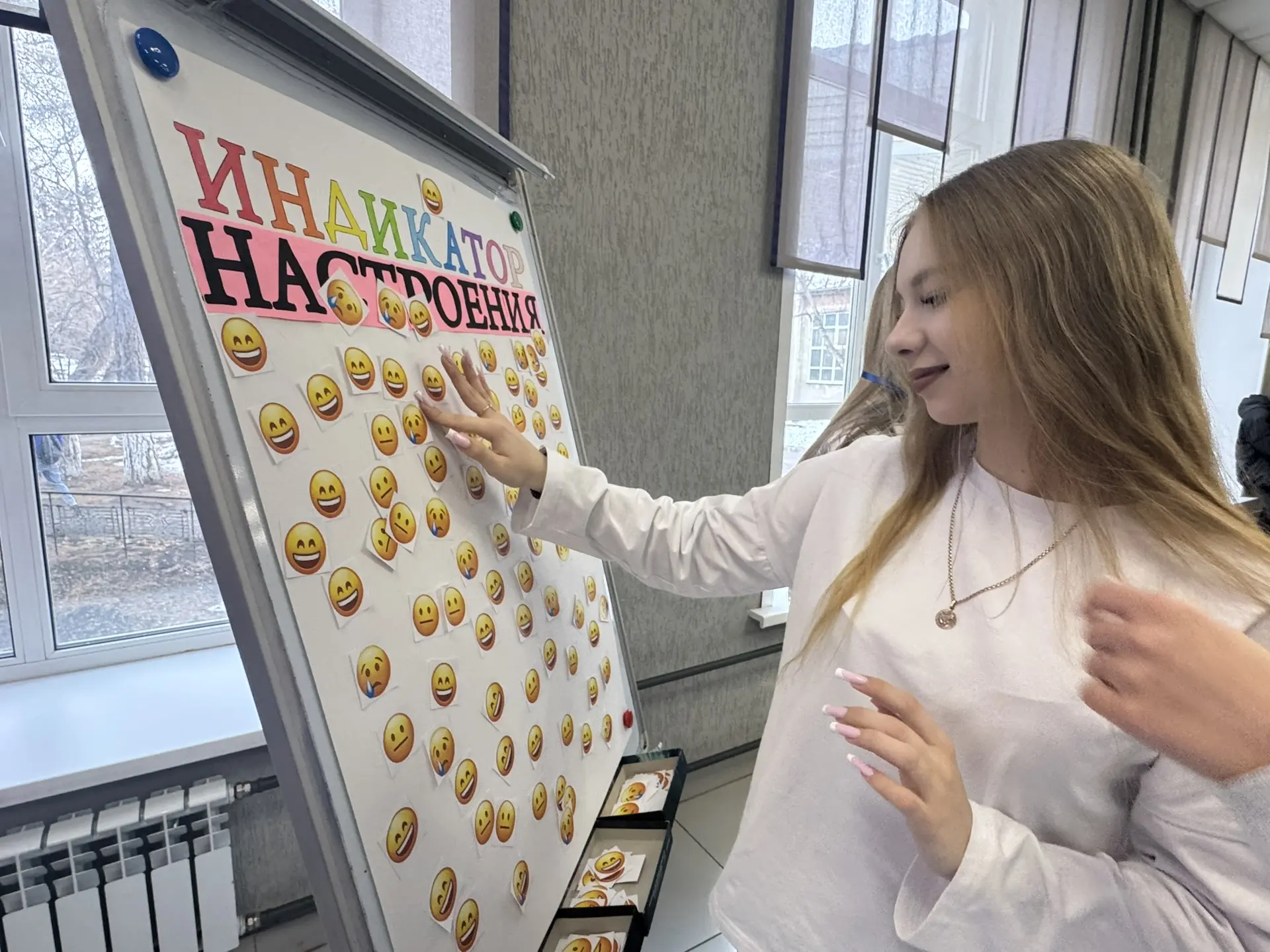 2. Индикатор настроения 😡😢😐😁Повесили плакат, выдали стикеры. Всё анонимно. Кидай свой цвет и смотри — оказывается, ты не один. Солидарность лечит.