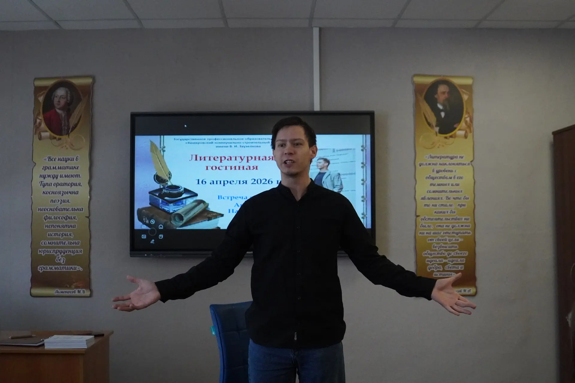 В нашем техникуме прошла очередная встреча в Литературной гостиной. Встреча с Кузбасским поэтом, автором и артистом литературного шоу «Чат», «Сигнал» и «Что – то на молодежном», Андреем Назаровым.
