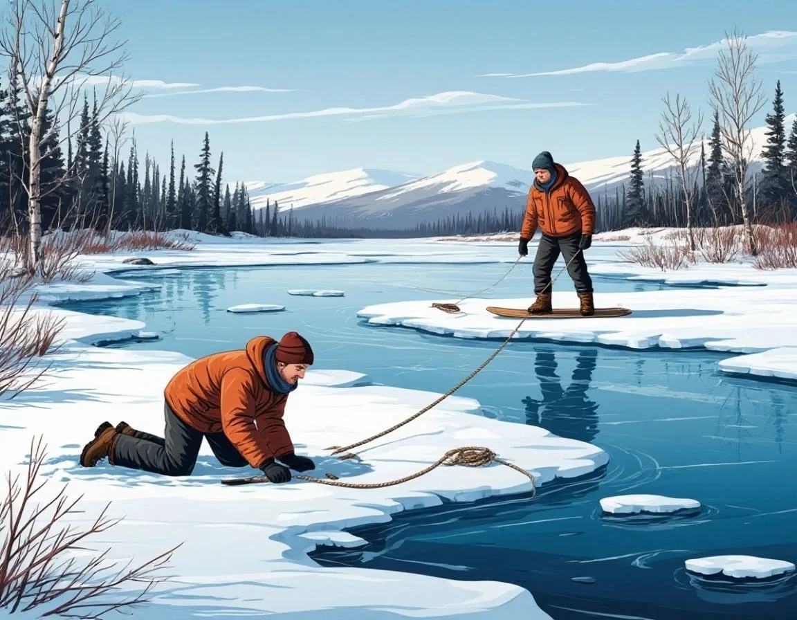 👉 Приближайтесь только ползком, широко раскинув руки и ноги. Можно подложить лыжи, доску.
