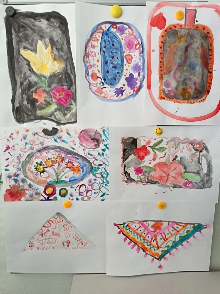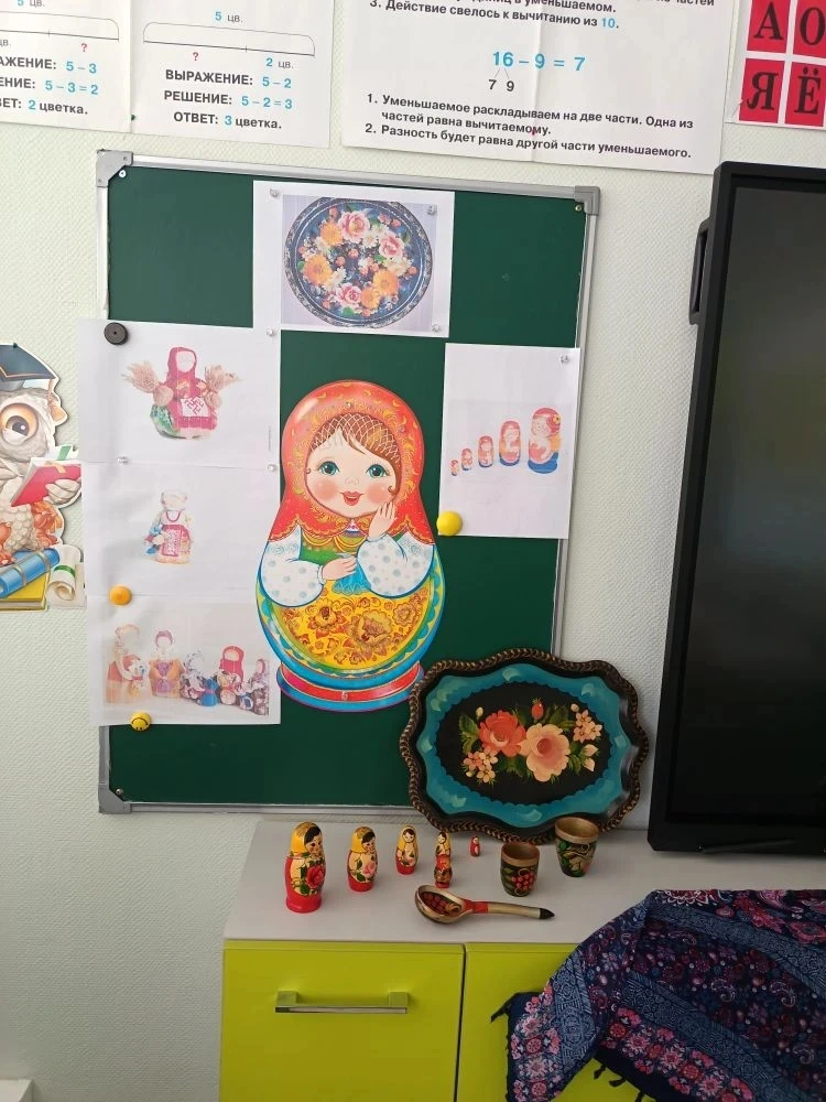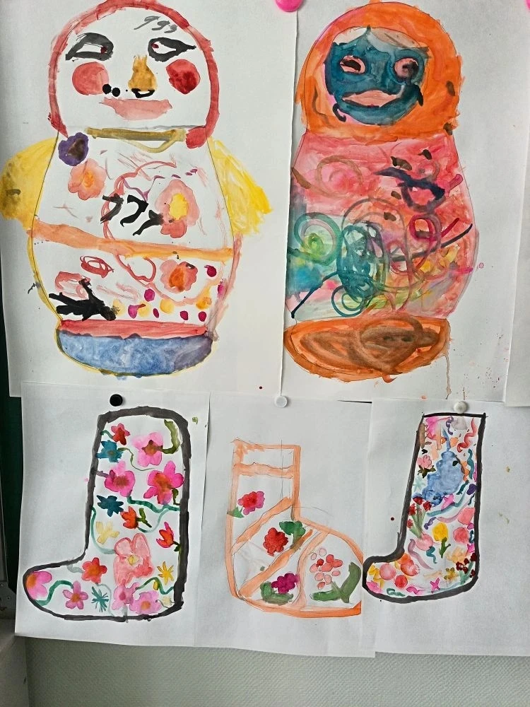 Ребята могли рассмотреть, потрогать руками и, конечно, попробовать сделать эскиз авторской матрёшки, разделочной досточки, роспись платка, валенка и многое другое.