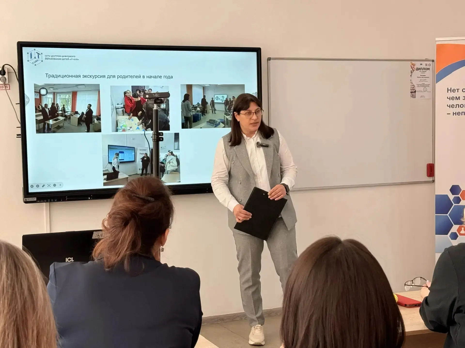 📝С докладом на тему «IT‑куб: реализация сетевого взаимодействия с образовательными учреждениями города» выступила Комова Т. Г., учитель информатики и директор IT‑куба, представившая опыт сотрудничества IT-куба с учебными заведениями нашего города.