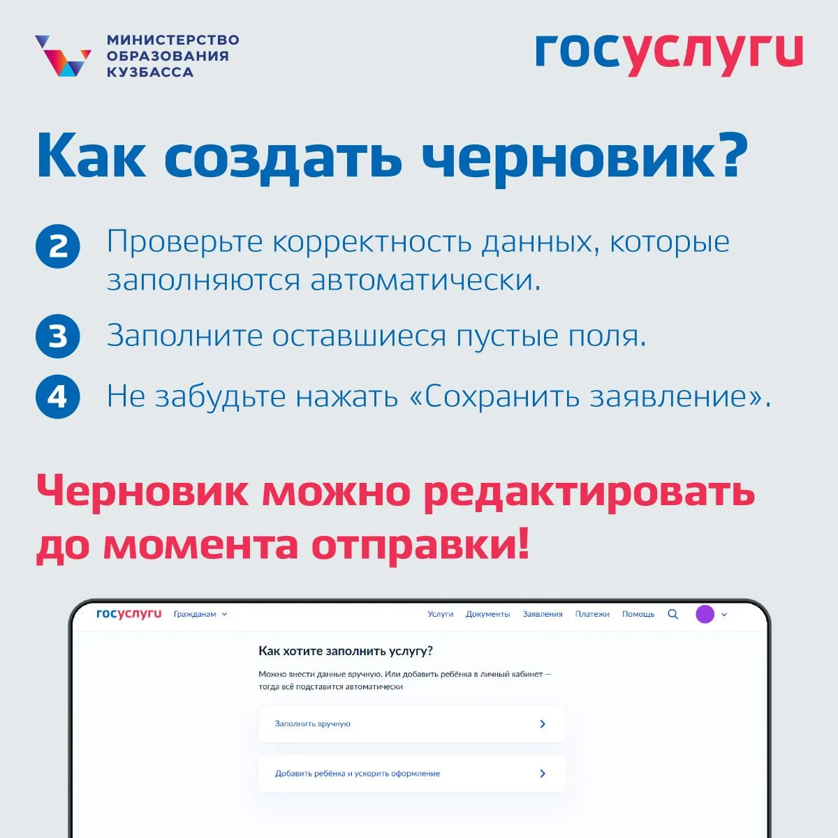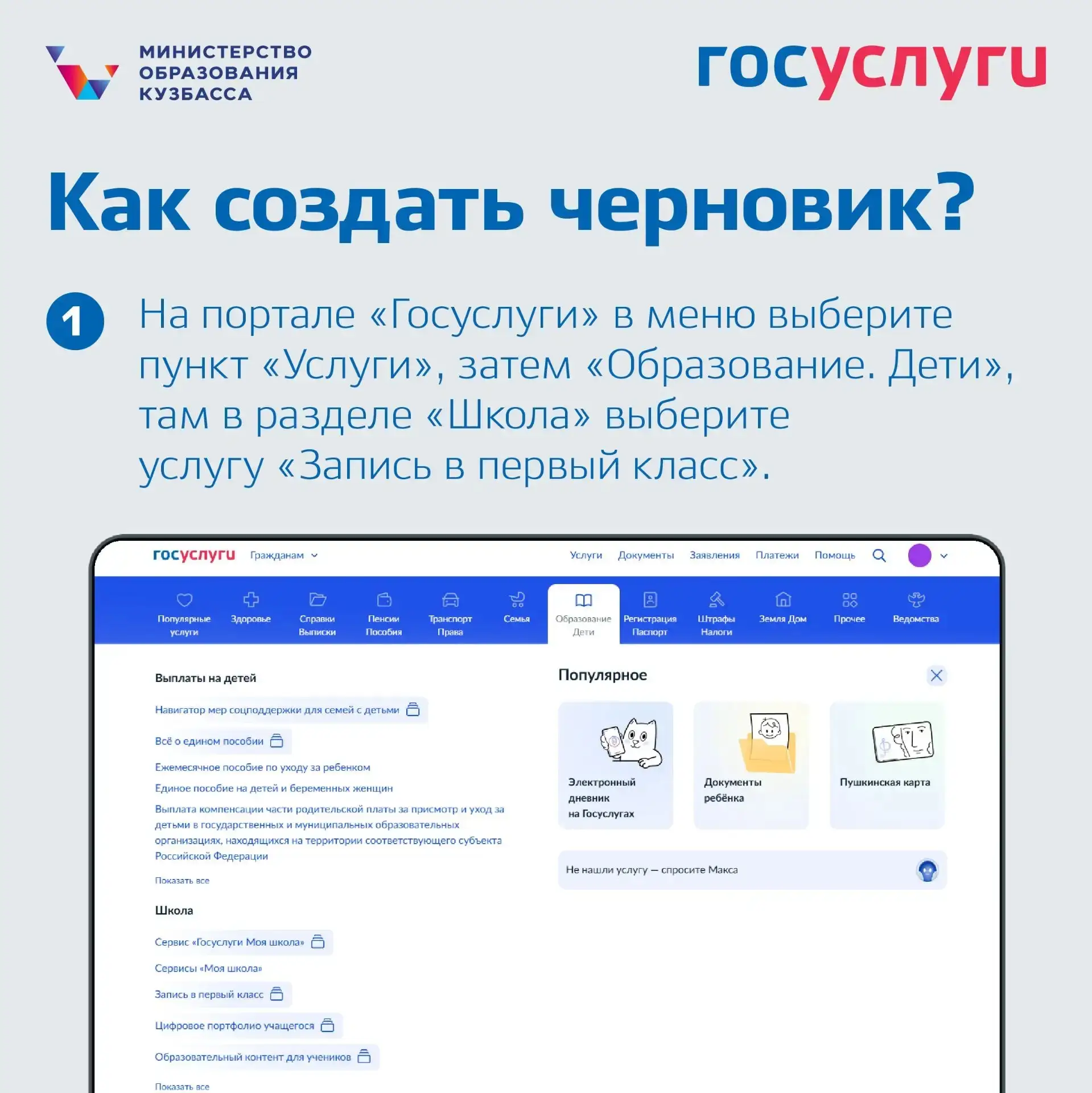 📌 Уже сейчас на портале «Госуслуги» и в Электронной школе 2.0 можно оформить черновик, чтобы подать заявление сразу после открытия записи — 1 апреля.