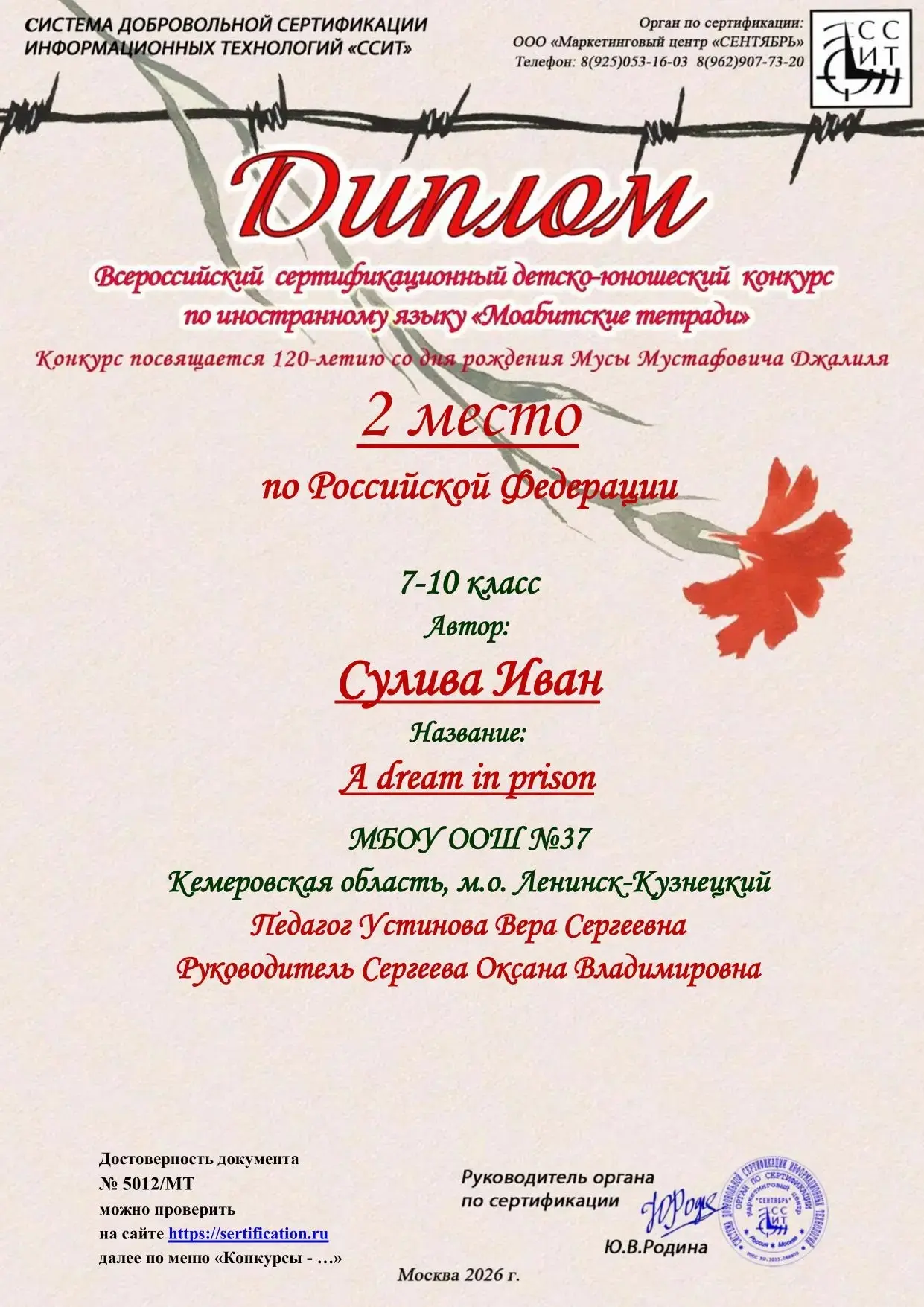 💫В рамках конкурса Иван представил выразительное чтение стихотворения A Dream in Prison. От всей души поздравляем Ивана с высоким достижением и желаем ему дальнейших творческих успехов и новых побед на конкурсах различного уровня.