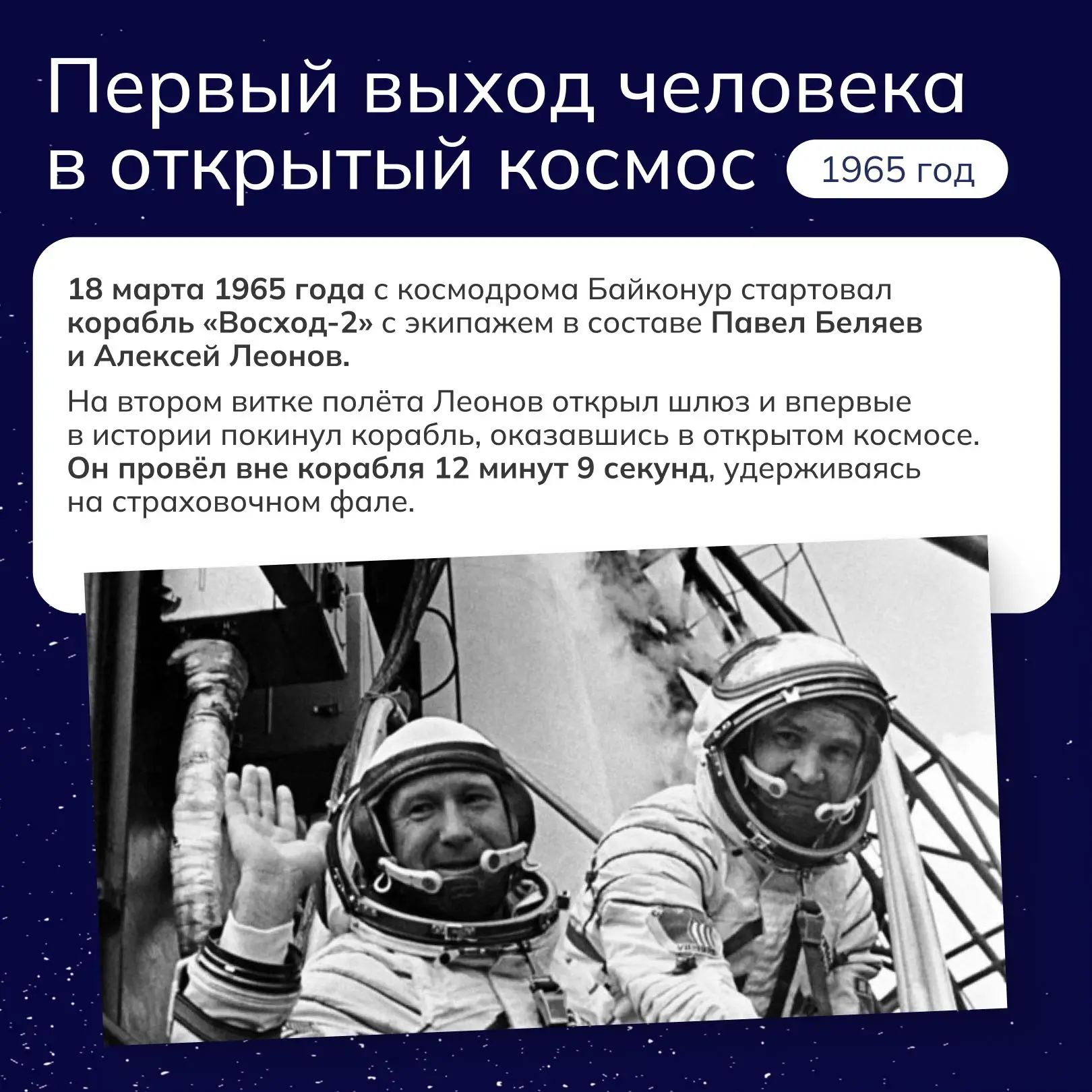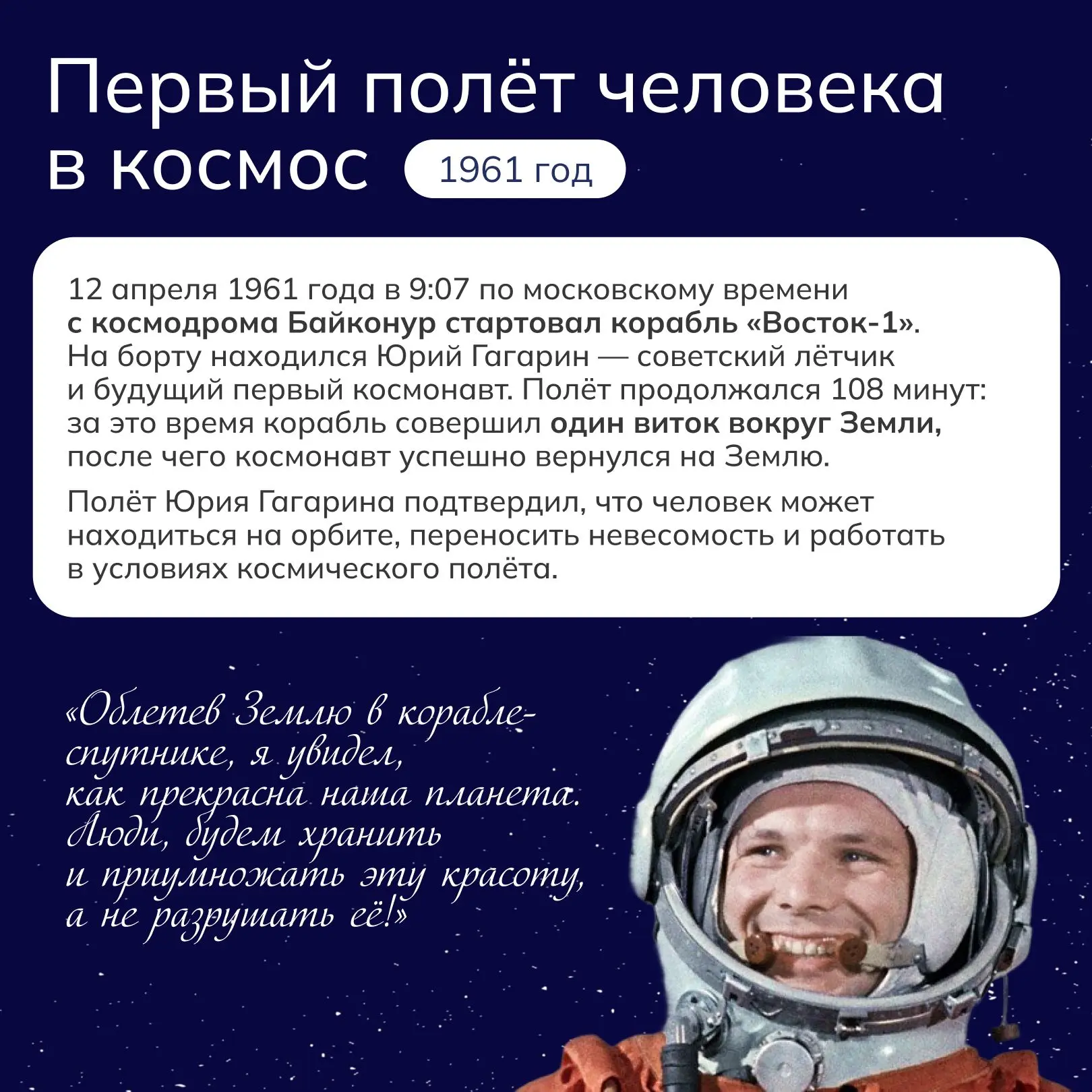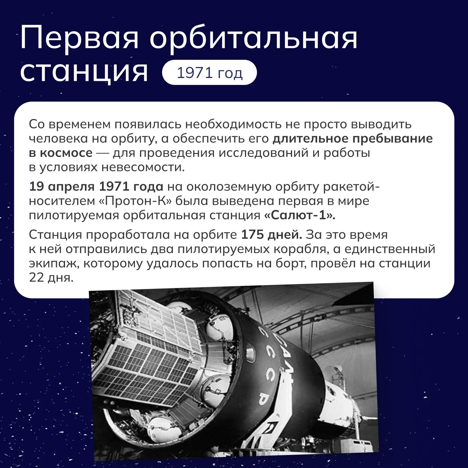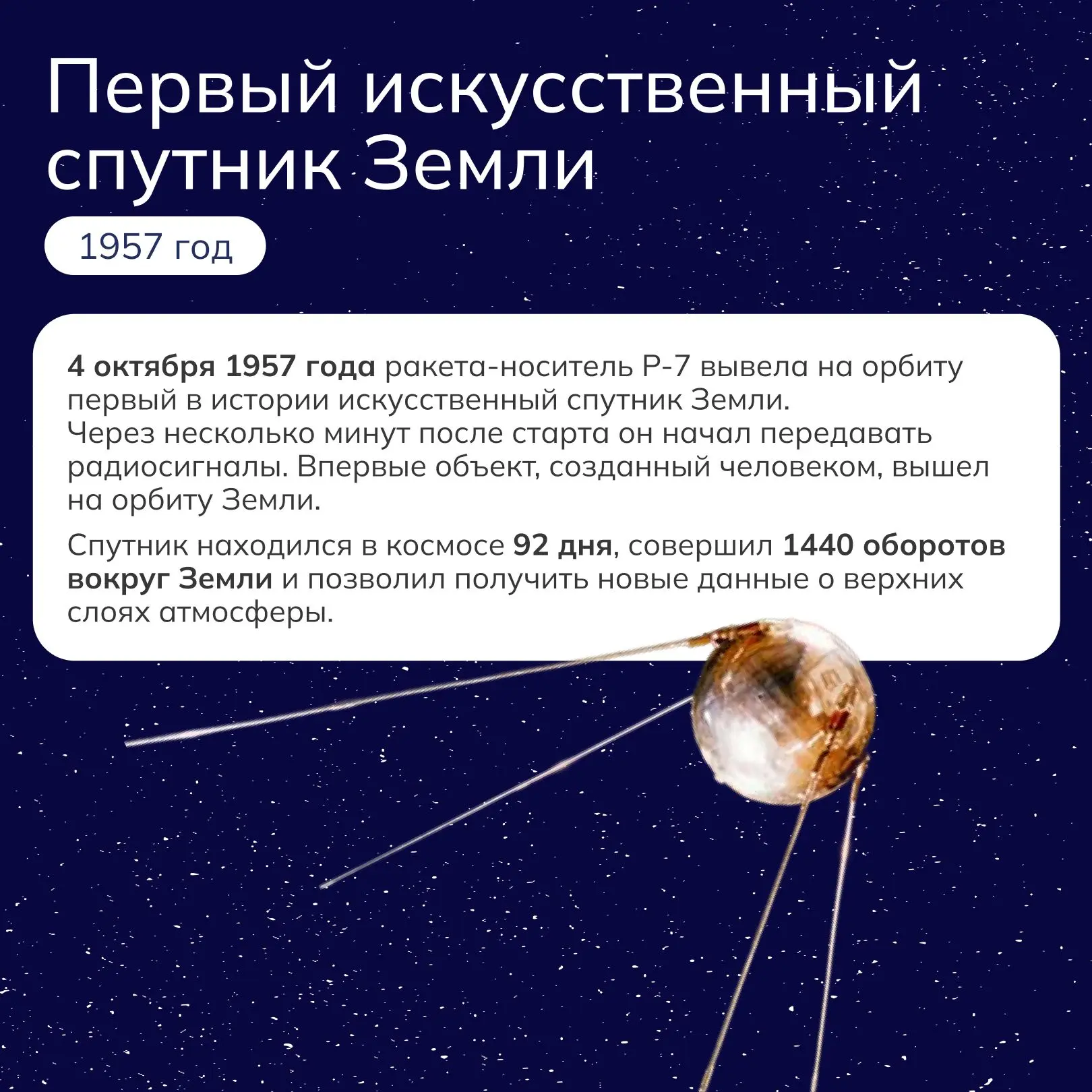 Именно в СССР были сделаны первые шаги к освоению космоса, которые изменили ход мировой истории: запуск первого спутника, полёт человека, выход в открытое космическое пространство и создание орбитальных станций.