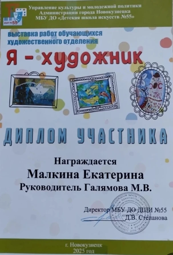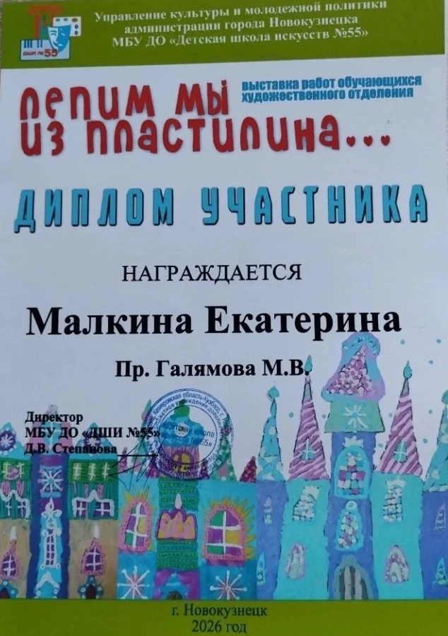Поздравляем Катю Малкину, ученицу 3Б класса, с награждением дипломом участника выставки "Я художник" в библиотеке Лихачева! 🏆👏 Также Катя приняла участие в выставке "Лепим мы из пластилина", которая проходила в МБУ ДО "Детская школа искусств №55". 🖌️🧡