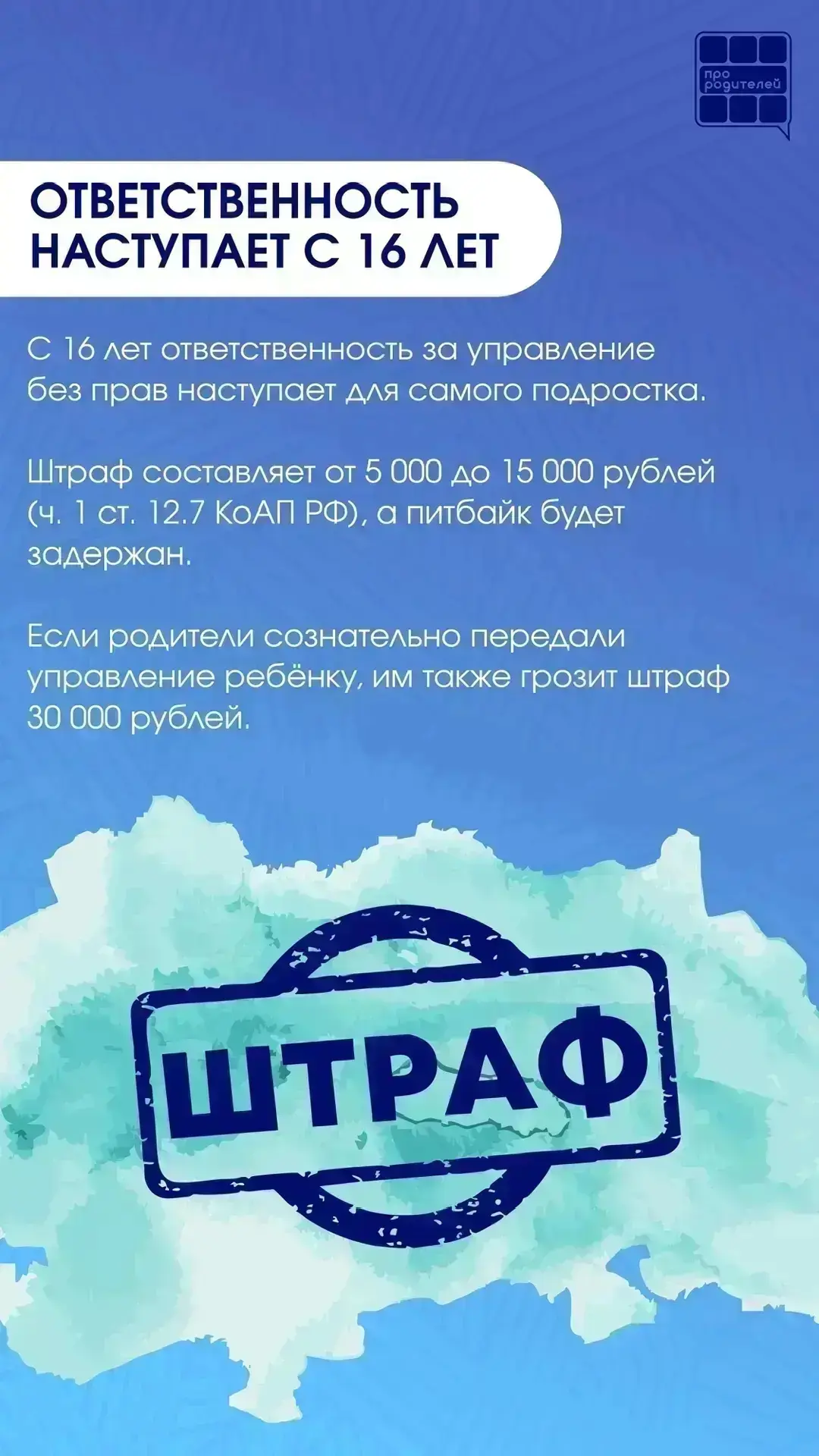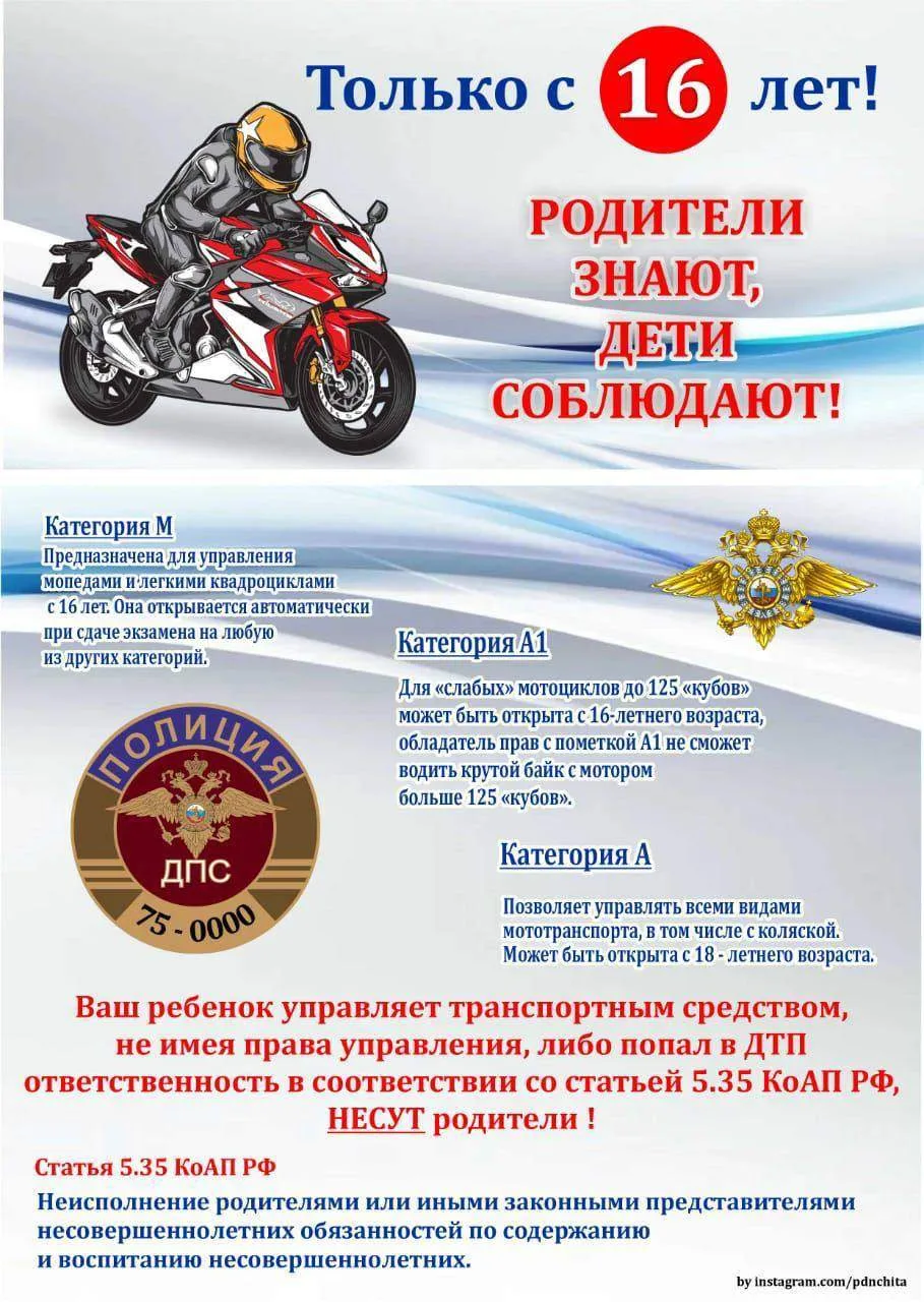 ▫️ Передача питбайка ребёнку до 16 лет — штраф 30 000 ₽ (ч. 3 ст. 12.7 КоАП РФ)
