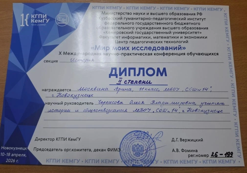 🥈 Дипломом II степени отмечена Москвина Арина (11 класс) и её научный руководитель Черкасова Олеся Владимировна (учитель истории и обществознания) в секции «История». 📜👏