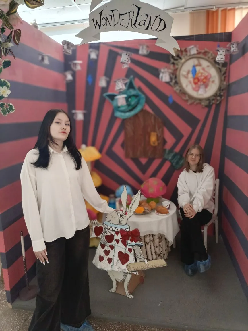 Начиная с входа, где нас встретила нестандартная фотозона 📸, и далее: в коридорах — стильные дизайнерские решения, необычный фотоуголок «Алиса в стране чудес» 🐇🎩. Даже педагоги не остались в стороне — была представлена фотоэкспозиция преподавателей в образах, которые для них подобрали студенты! 👗🎭