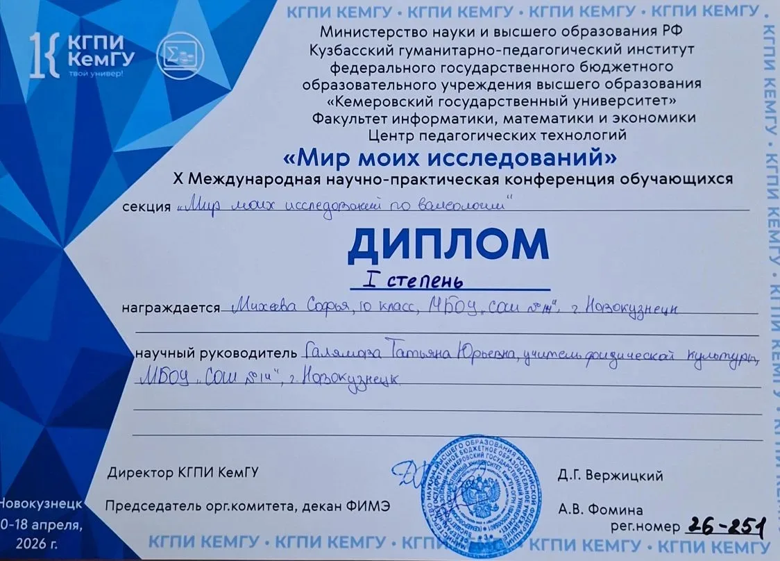 🏆 Дипломом I степени награждены Михеева Софья (10 класс) и её научный руководитель Галямова Татьяна Юрьевна (советник директора по воспитанию и взаимодействию с общественными объединениями) в секции «Мир моих исследований по валеологии». 🥇💚