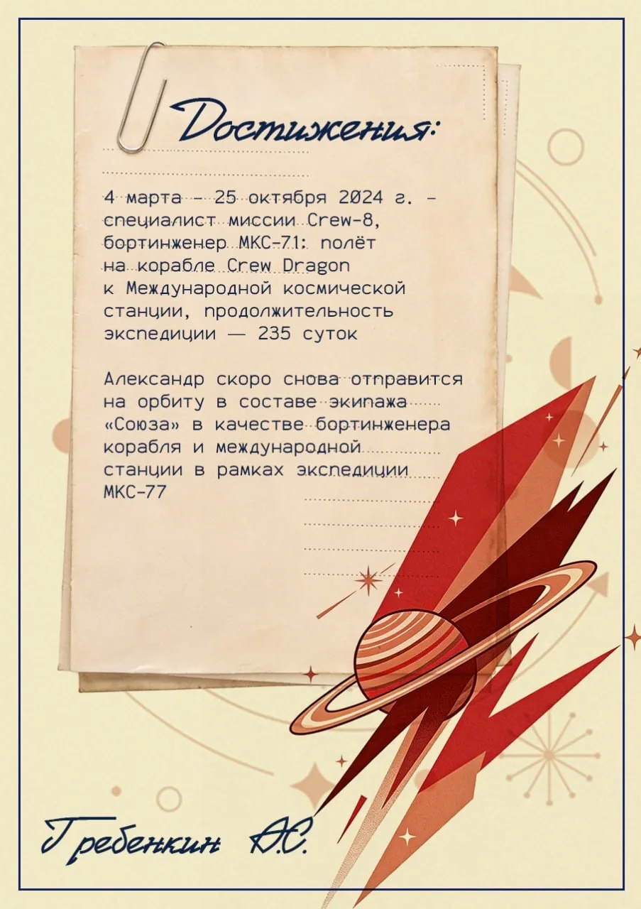 🔹 Александр Гребёнкин — в 2024 году провёл 235 суток на МКС в составе международного экипажа, продолжив традиции предшественников.