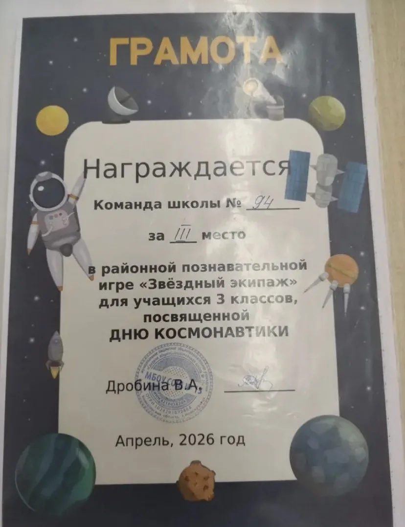 Сборная команда третьеклассников нашей школы приняла участие в районной познавательной игре «Звездный экипаж», посвященной Дню космонавтики! Ребята показали уверенность в себе, отличные знания, сплоченность и командный дух! В итоге при поддержке взрослых - III место! Поздравляем и гордимся! #школа94новоильинскийрайон2026 #учусьвКузбассе2026