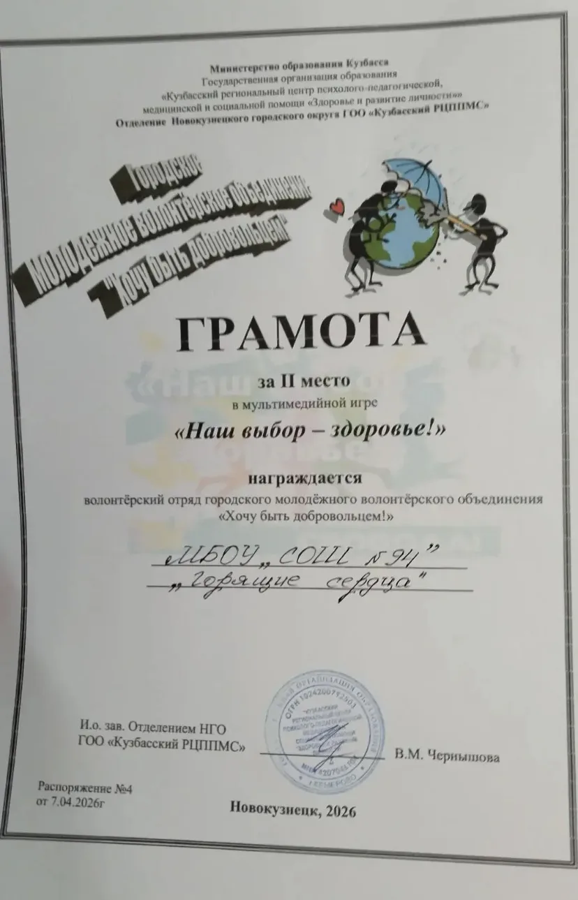 Наши волонтеры снова доказали, что они лучшие! Команда активистов волонтерского отряда школы «Горящие сердца» под руководством Е.А. Фоменко снова вошла в тройку призеров городского конкурса - мультимедийной игры «Наш выбор - здоровье!». Поздравляем команду школы с 2 местом! Они еще раз доказали, что волонтерское детское общественное объединение школы работает слаженно и динамично! #школа94новоильинскийрайон2026 #Горящиесердца2026