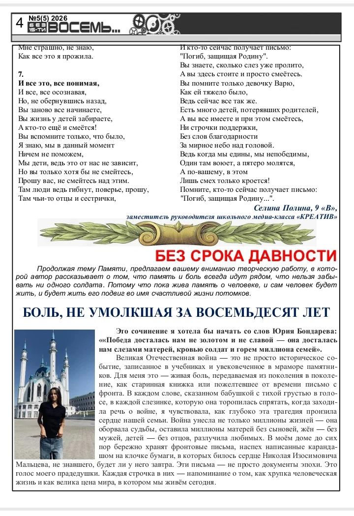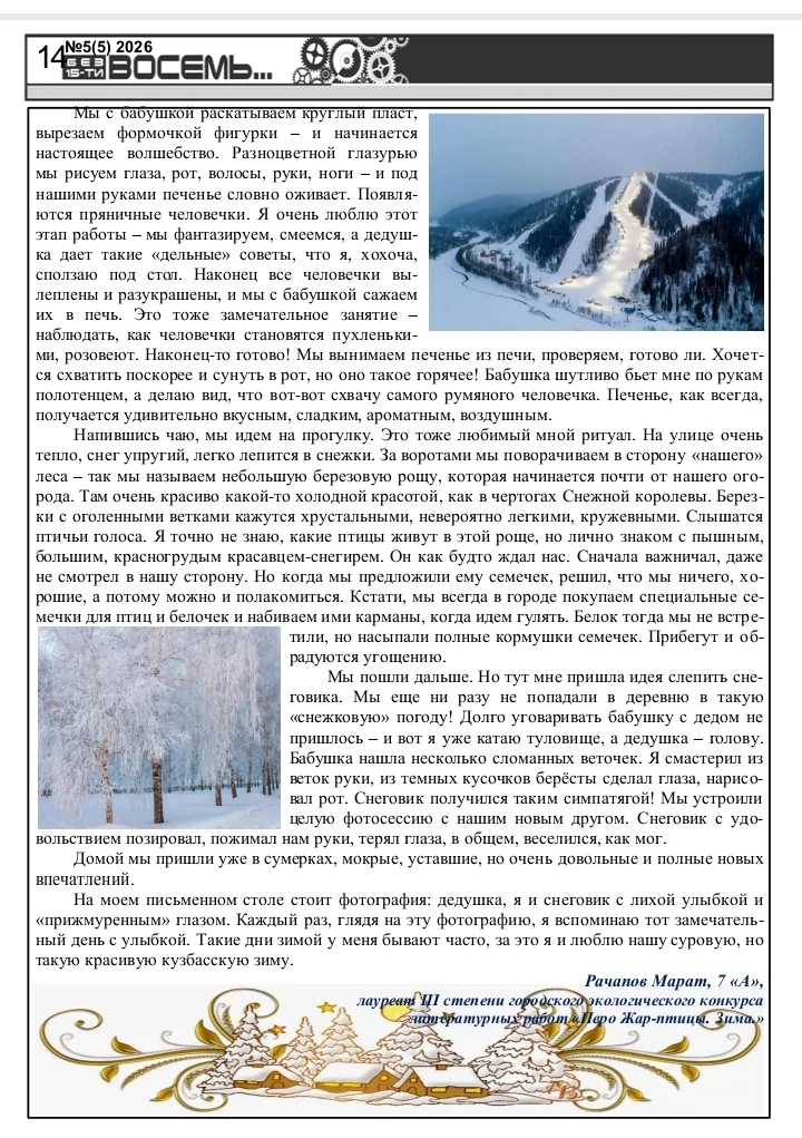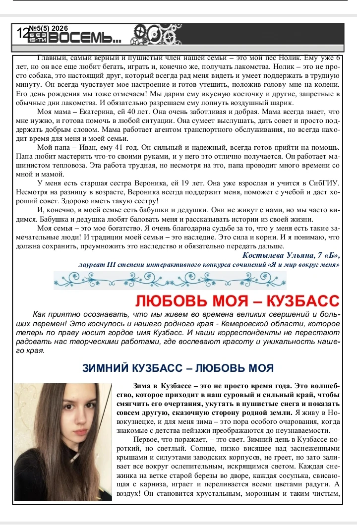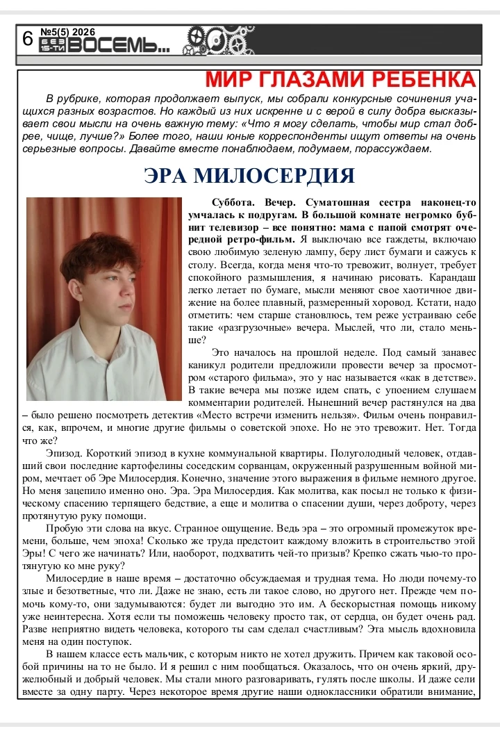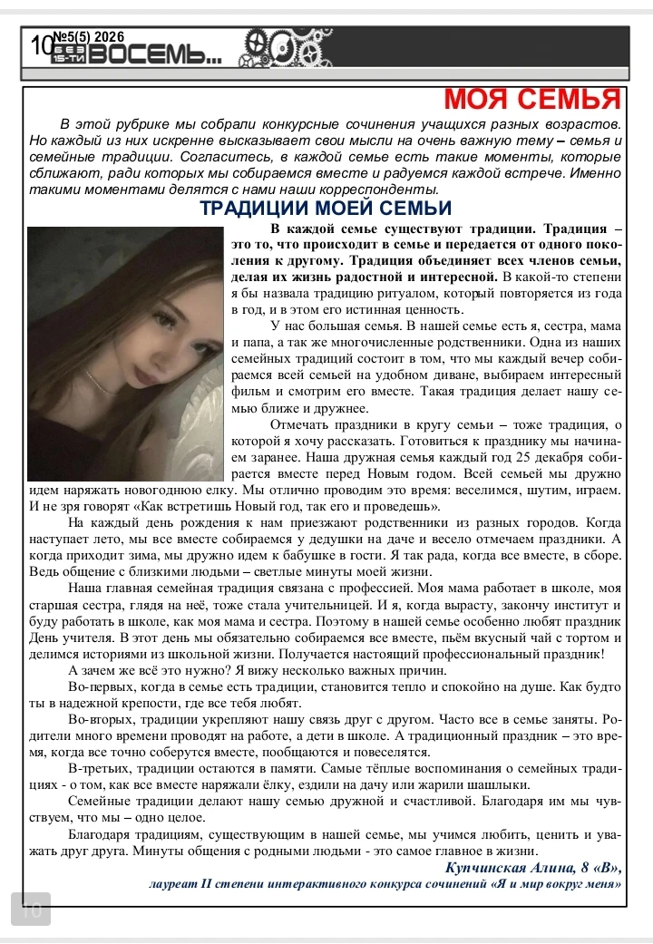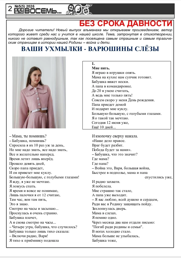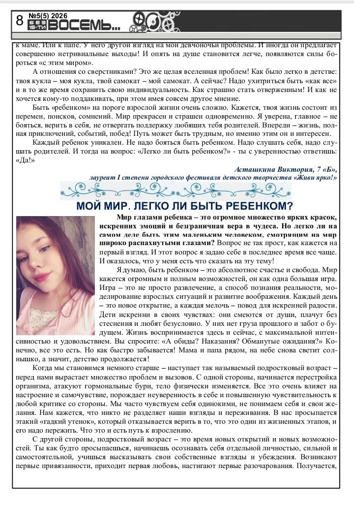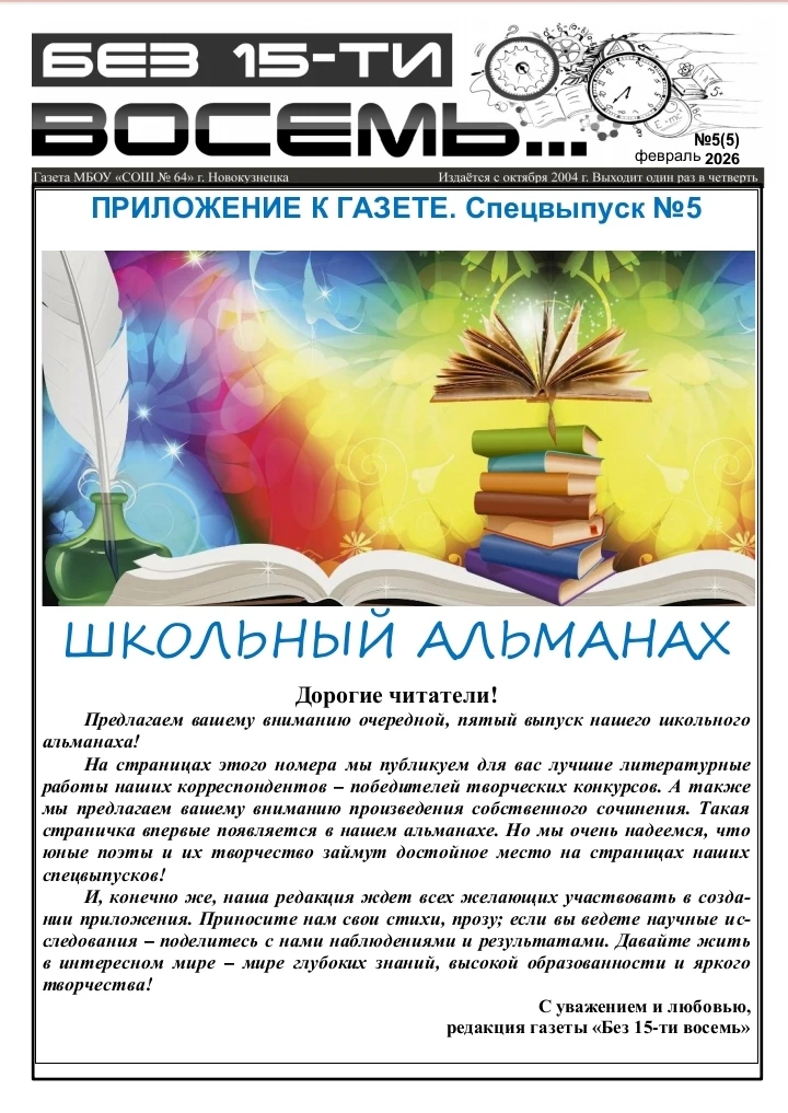 Дорогие читатели! Вас приветствует редакционная коллегия школьной газеты "Без 15-ти восемь"! Предлагаем вашему вниманию пятый выпуск Школьного альманаха! Приглашаем вас разделить с нами восхищение талантливыми школьниками, прочитать замечательные творческие работы. Предлагаем вашему вниманию не только конкурсные сочинения, но и очень серьезные литературные произведения, поднимающие глубокие и важные проблемы. Ждем ваши искренние и добрые отзывы и комментарии! Приятного чтения!