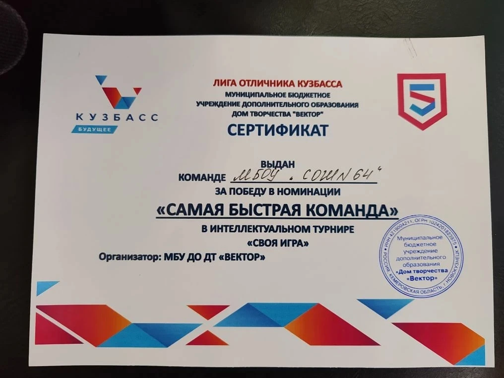 Школьники проявили не только эрудицию, но и молниеносную реакцию! Итог — заслуженная победа в номинации «Самая быстрая команда» и памятный сертификат.