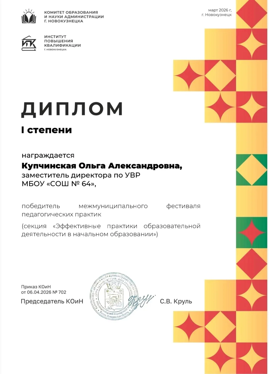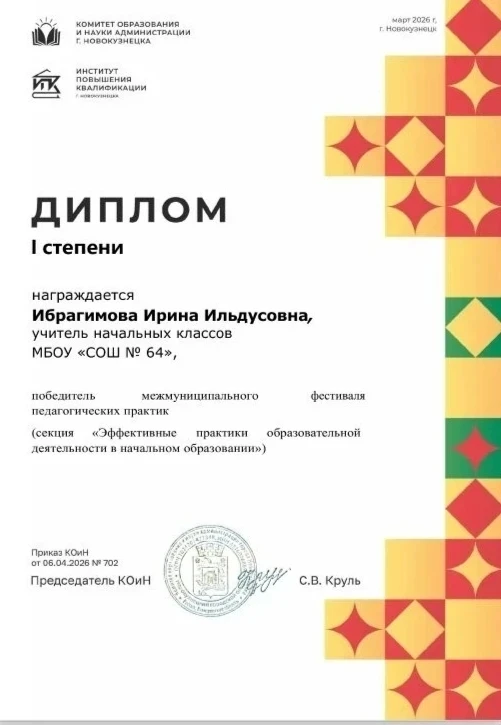 Победителями в секции «Эффективные практики образовательной деятельности в начальном образовании» стали Ольга Александровна Купчинская – заместитель директора по УВР и Ирина Ильдусовна Ибрагимова - учитель начальных классов. Они награждены Дипломом I степени.