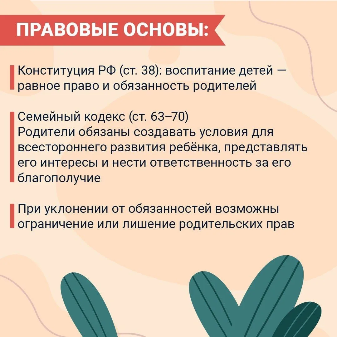 Родители — главные наставники ребёнка. Их роль закреплена законом. Забота, воспитание и обеспечение образования — не просто моральный долг, а юридическая обязанность.
