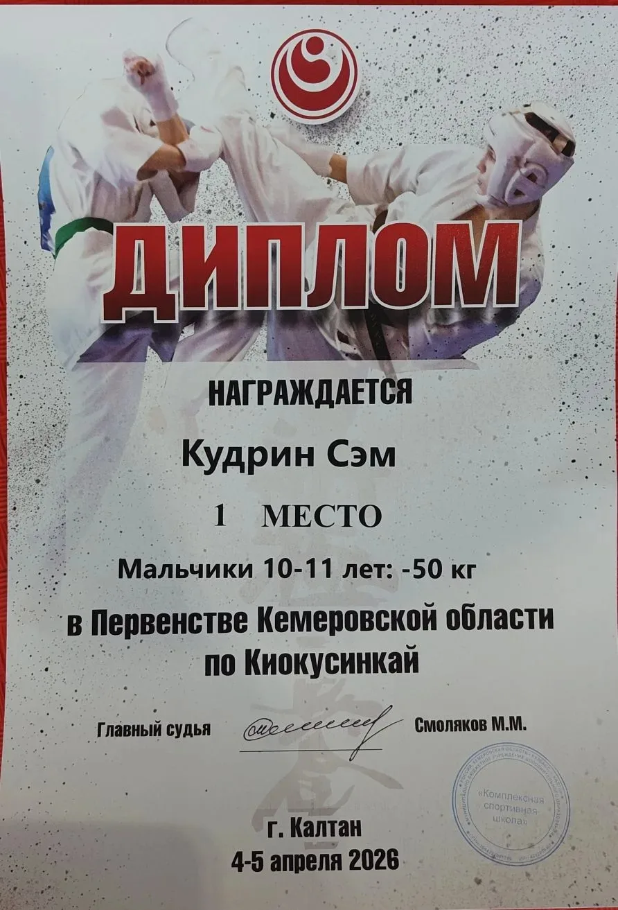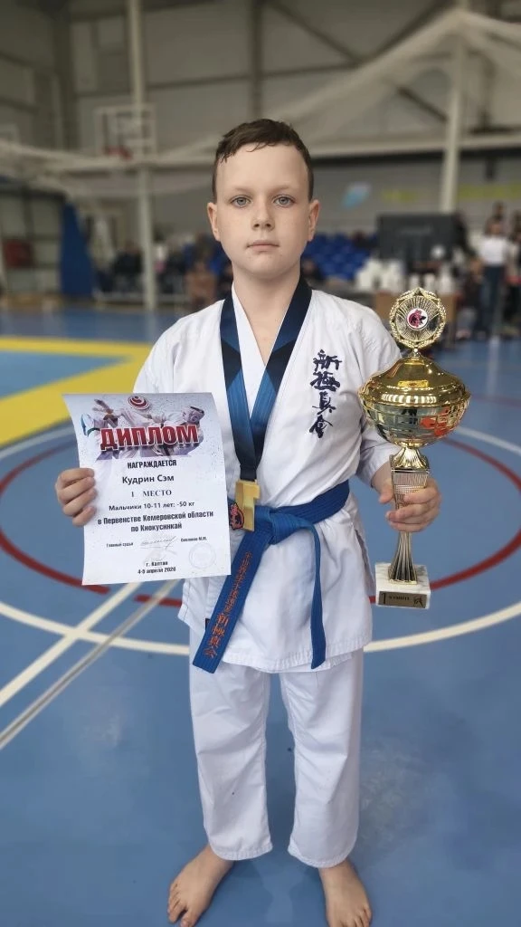 Наш ученик 5 «В» класса Кудрин Сэм занял 1-е место в первенстве Кемеровской области по Киокусинкай 🎉