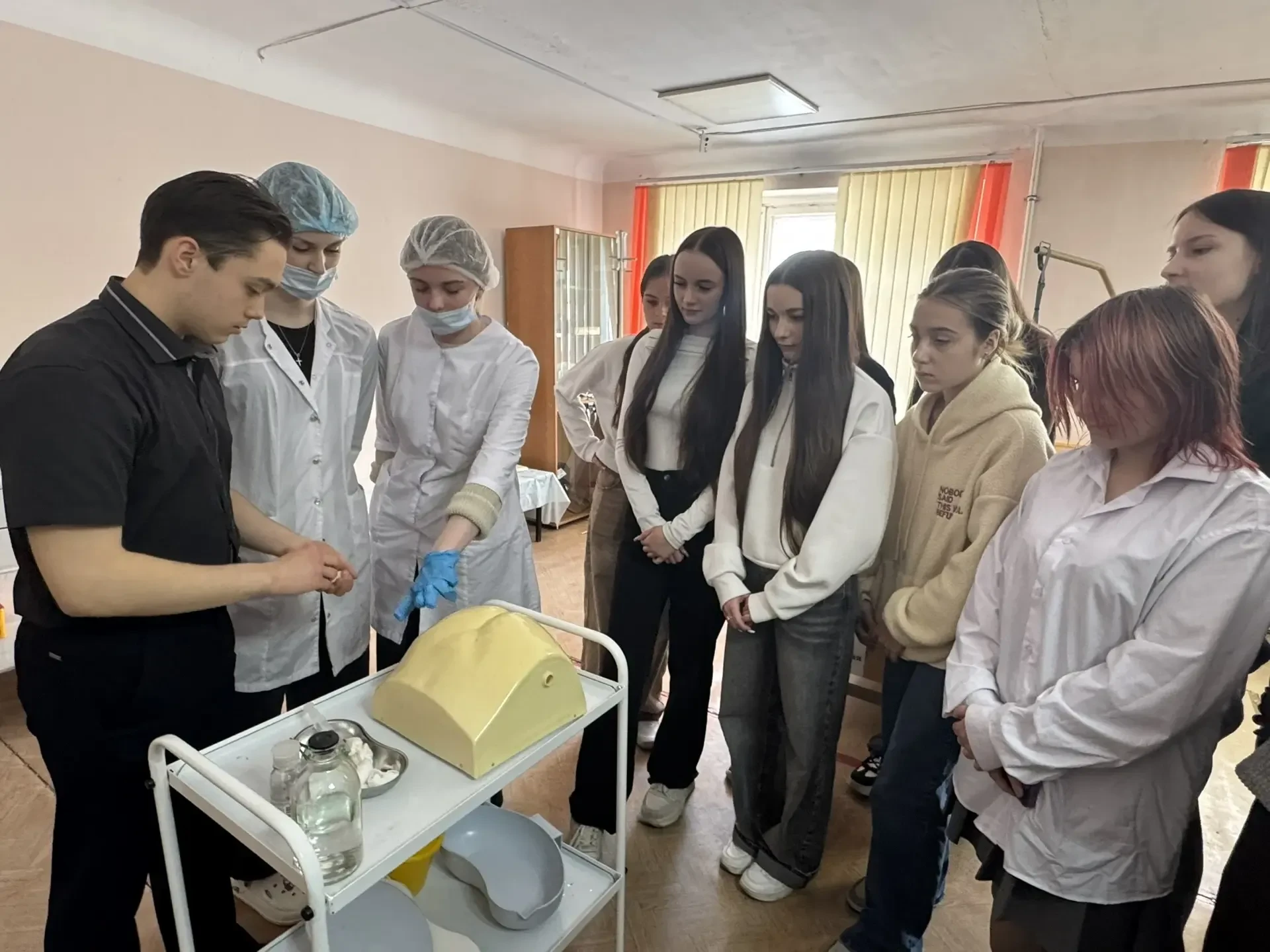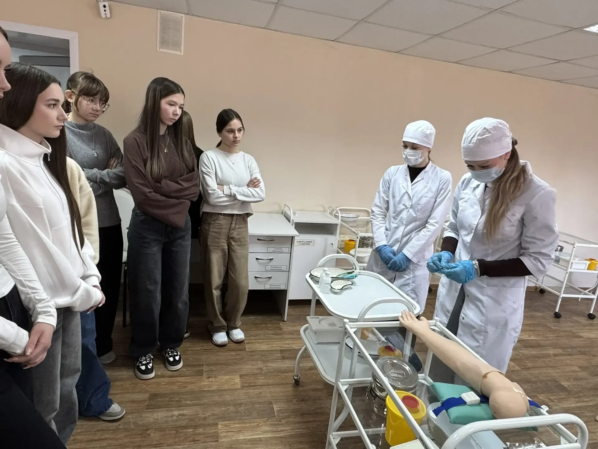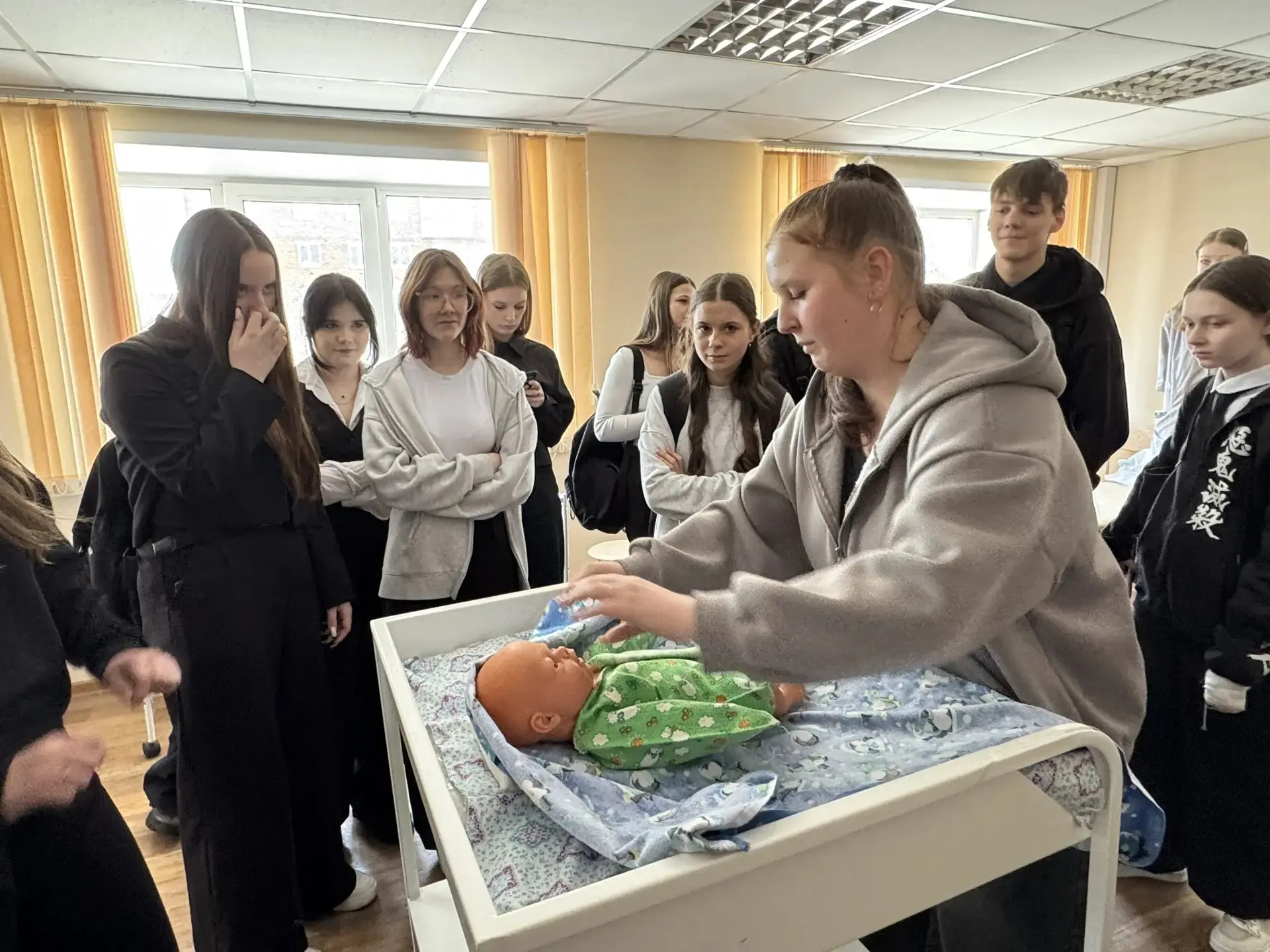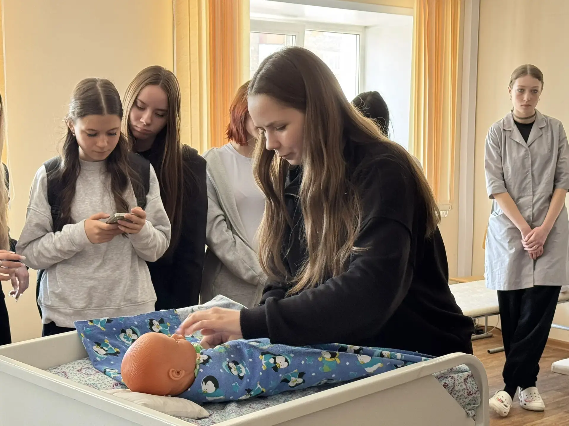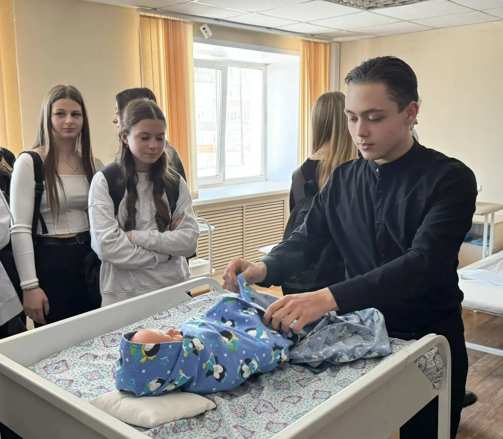 ✅Учащиеся смогли познакомиться с профессиями, связанными с медициной: сначала познакомились с основными направлениями подготовки будущих специалистов, узнали о требованиях к поступлению и учебе в медицинском колледже. Затем школьники приняли участие в мастер-классах, где попробовали себя в роли настоящих медиков — учились измерять давление, пеленать малыша, оказывать первую медицинскую помощь.