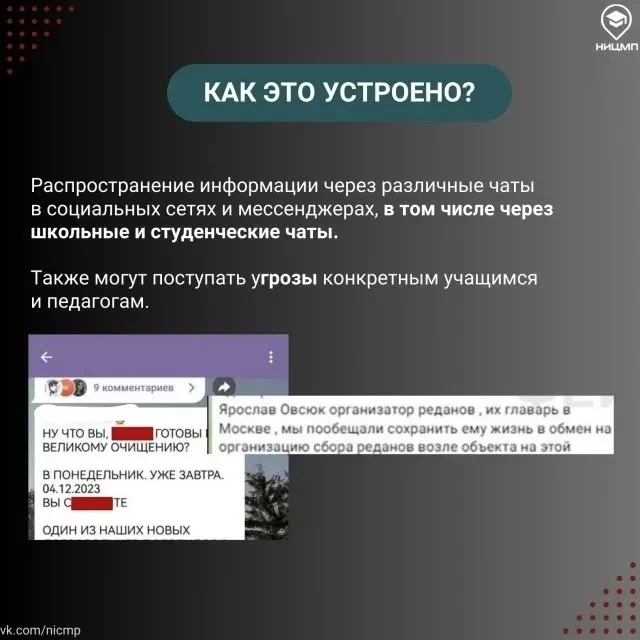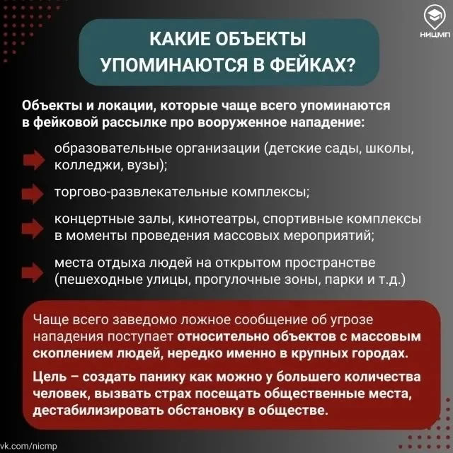 Сообщения распространяются в социальных сетях и мессенджерах в виде репостов из «специальных» каналов и чатов. Это транслируется, в том числе в форме массовых рассылок в школьные чаты для детей и родителей. Чаще всего заведомо ложное сообщение об угрозе теракта поступает относительно объектов с массовым скоплением людей: школы, колледжи, вузы, торгово-развлекательные комплексы и т.д.