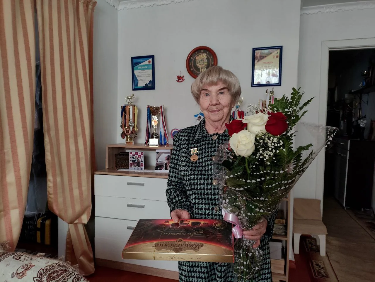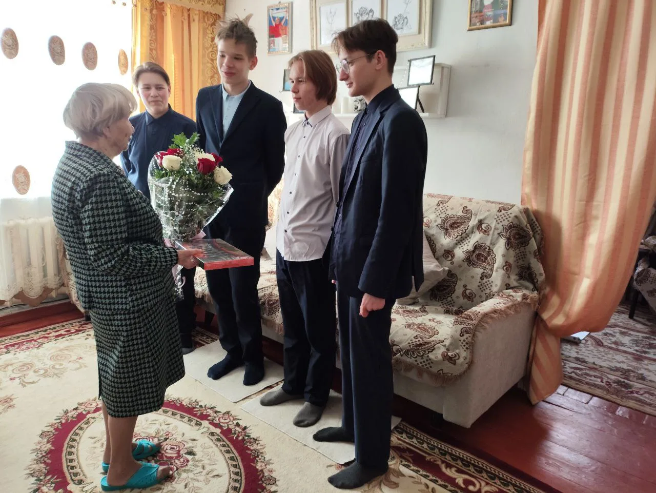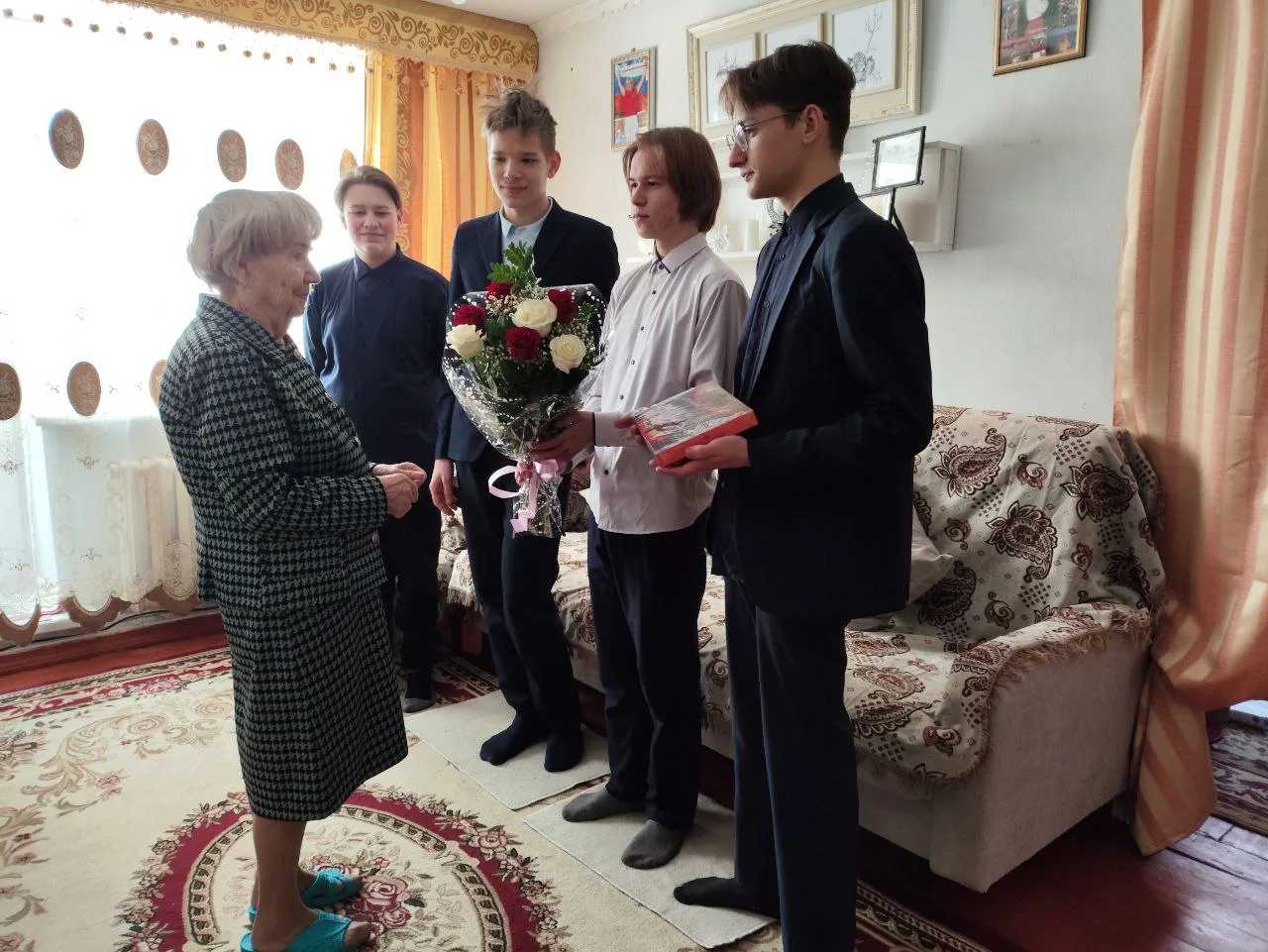 Людмила Станиславовна пережила страшные дни войны и будучи трехлетним ребёнком, была эвакуированна в наш город, воспитывалась в детском доме №2 в Зенково. Сегодня она тепло приняла поздравления от учеников и педагогов нашей школы. А ребята искренне поблагодарили прекрасную женщину за мужество и стойкость целого поколения советских людей, подаривших нам мирное небо над головой.