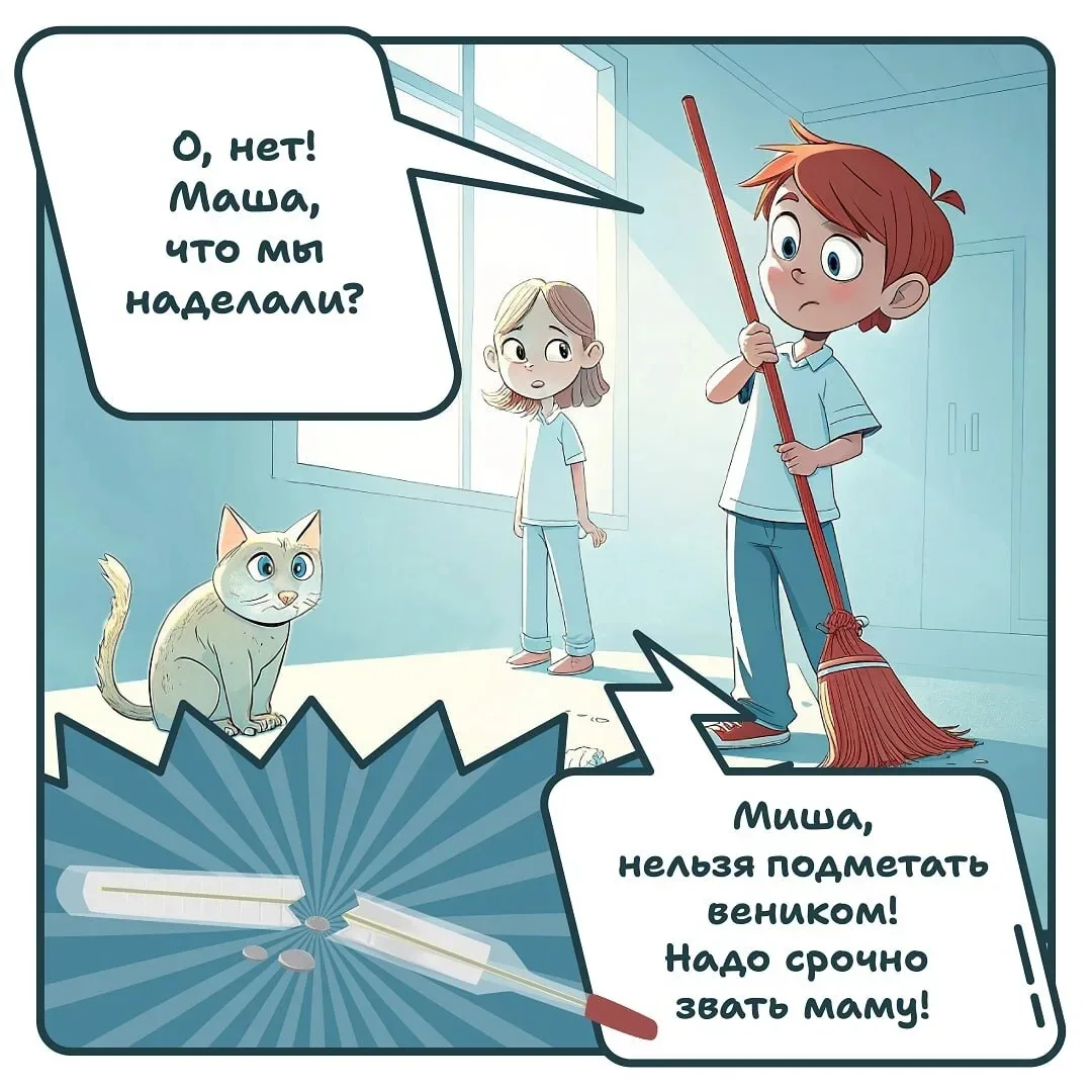 ✅ Первым делом постарайтесь вывести всех из комнаты, где разбился градусник.