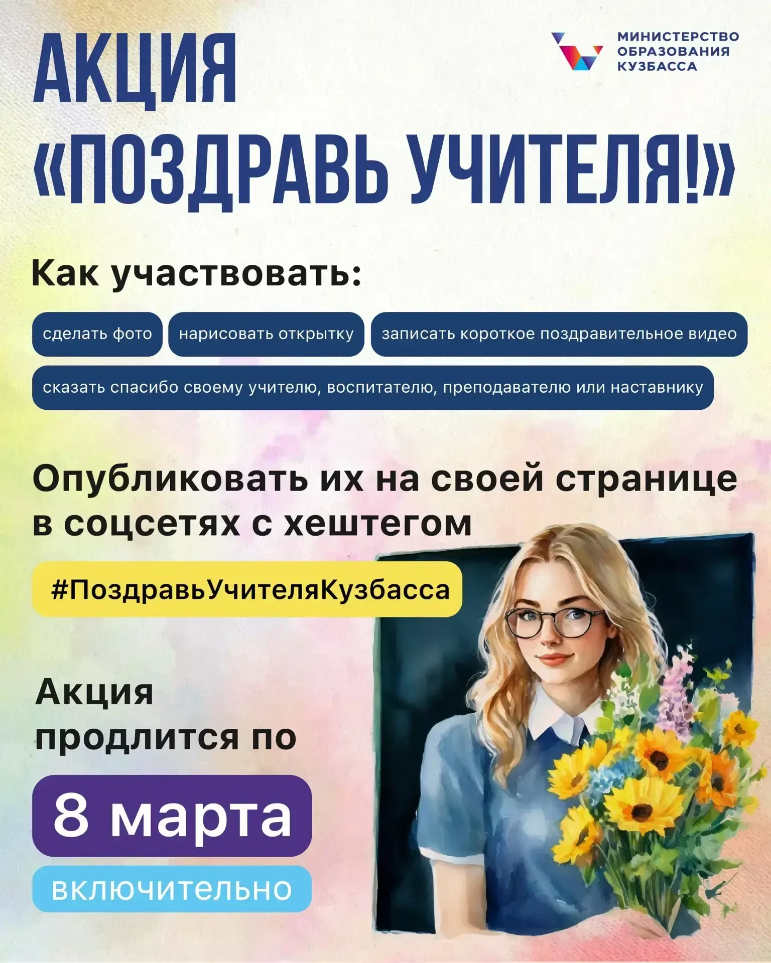 ✅Главное — опубликовать пост на своей странице в соцсетях с хештегом #ПоздравьУчителяКузбасса.