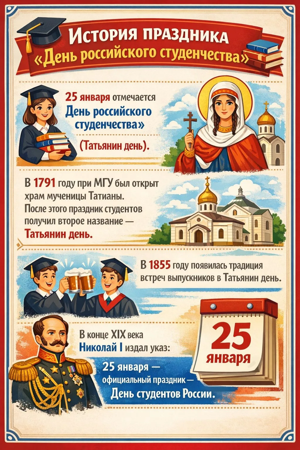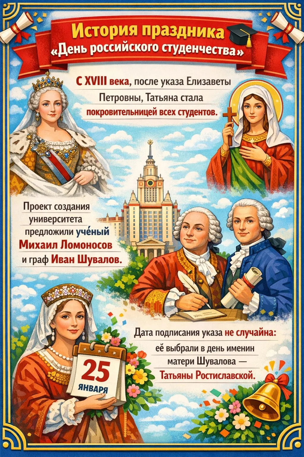12 (25) января 1755 года императрица Елизавета Петровна подписала указ об учреждении Московского университета. С тех пор Татьянин день стал праздноваться сначала как день рождения университета, позже как День студентов.