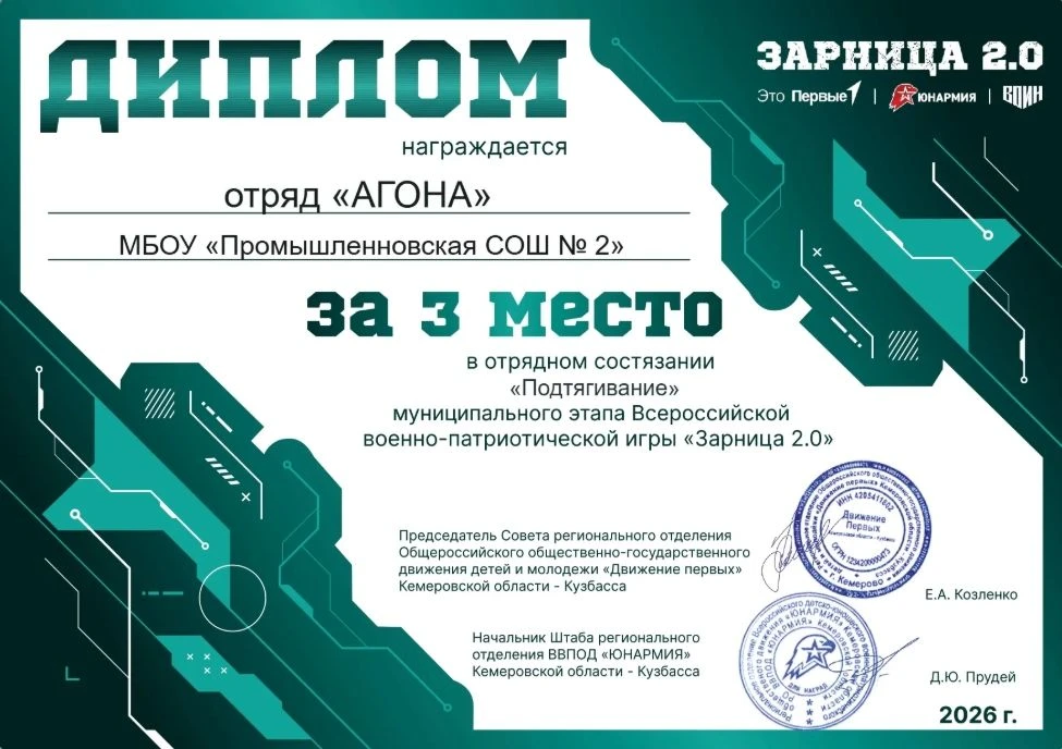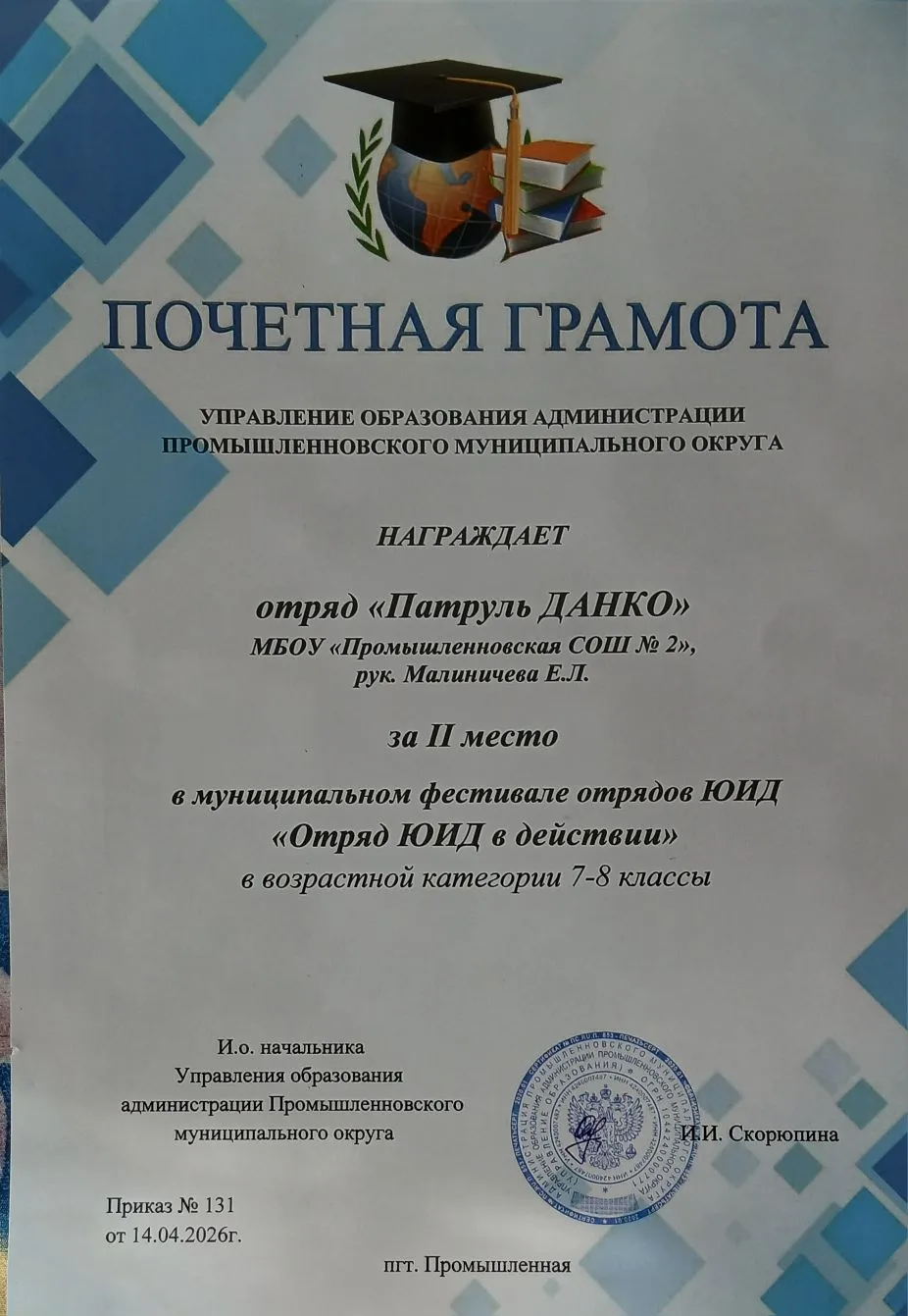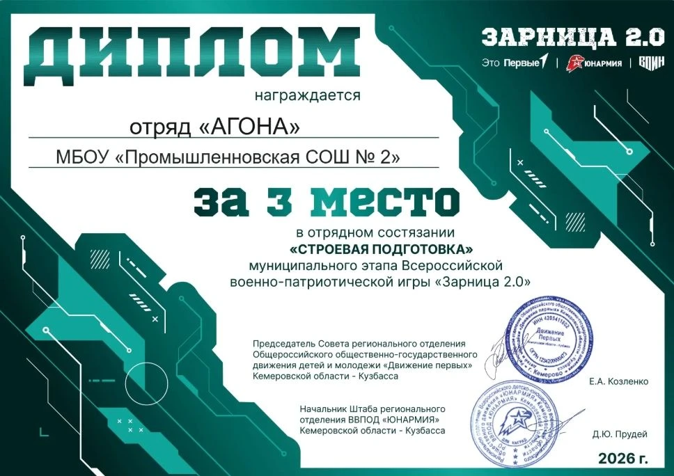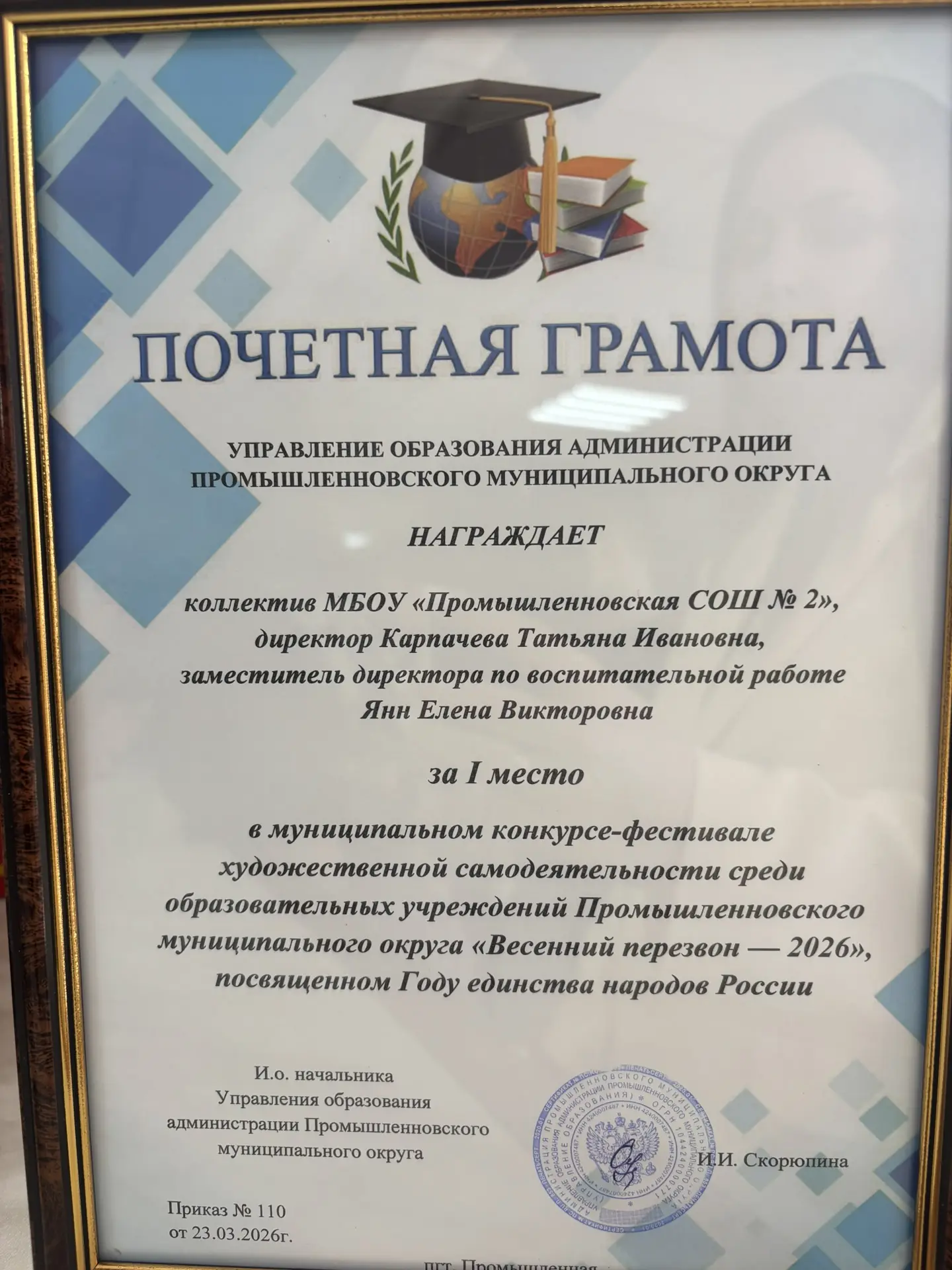 По результатам проведения муниципального конкурса-фестиваля «Весенний перезвон- 2026» и за эффективную работу по патриотическому и эстетическому воспитанию обучающихся, их гражданскому становлению, раскрытию творческих способностей среди образовательных организаций Промышленновского муниципального округа МБОУ «Промышленновская СОШ №2» -1 место.