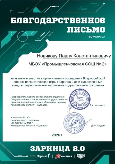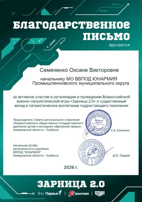 ✅Благодарственными письмами Регионального отделения Движение Первых Кемеровской области - Кузбасса и Штабом Регионального отделения ВВПОД "ЮНАРМИЯ" Кемеровской области-Кузбасса за активное участие в организации и проведении Всероссийской военно-патриотической игры "Зарница 2.0" и существенный вклад в патриотическое воспитание подрастающего поколения награждены Семененко Оксана Викторовна, начальник Местного отделения ВВПОД "ЮНАРМИЯ" Промышленновского муниципального округа и Новиков Павел Константинович👍