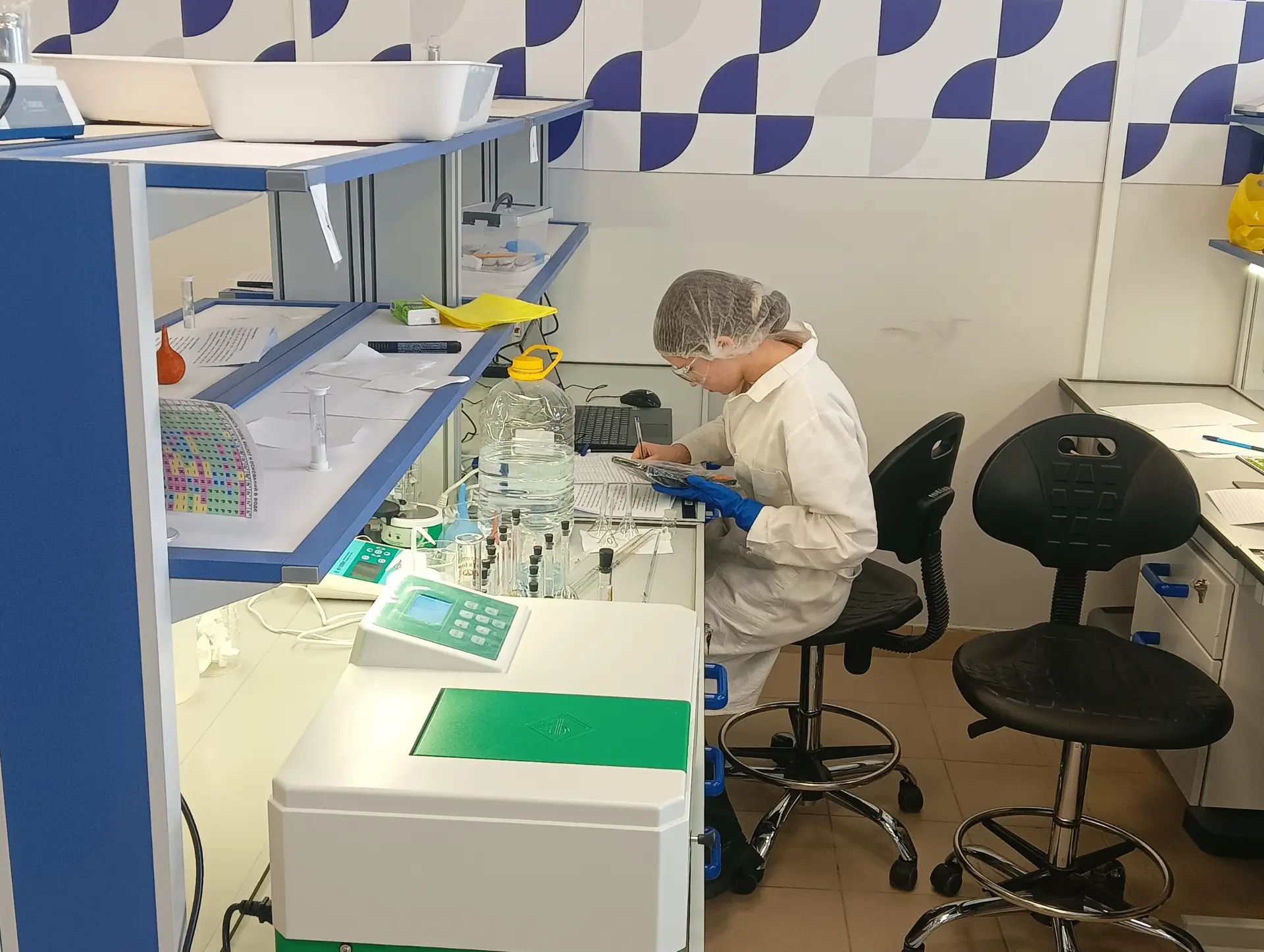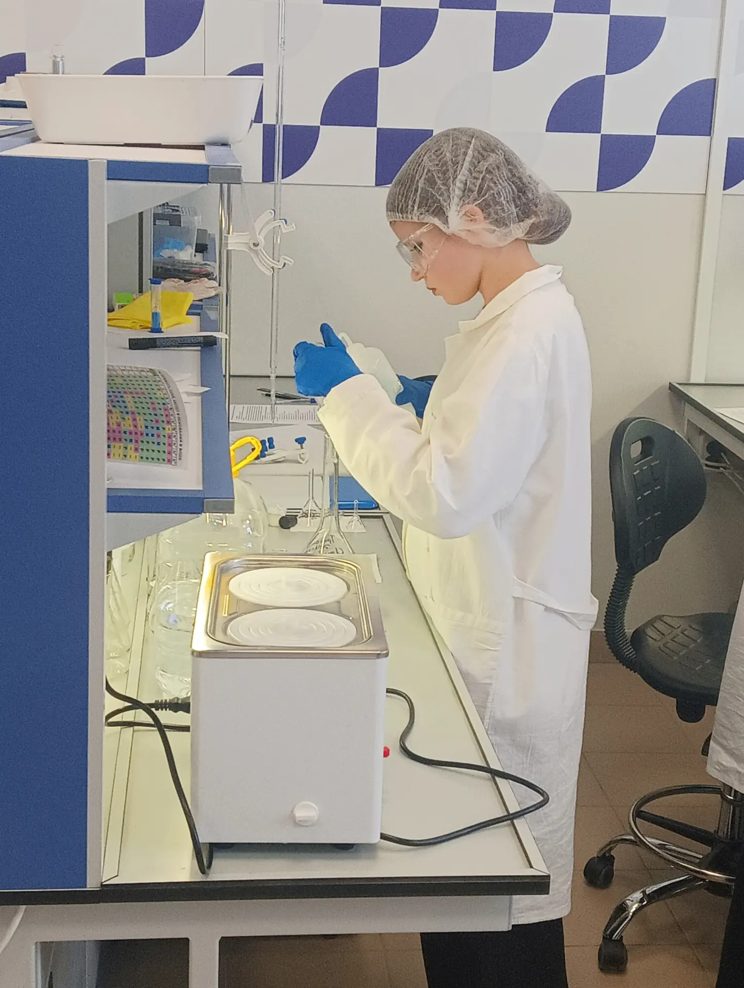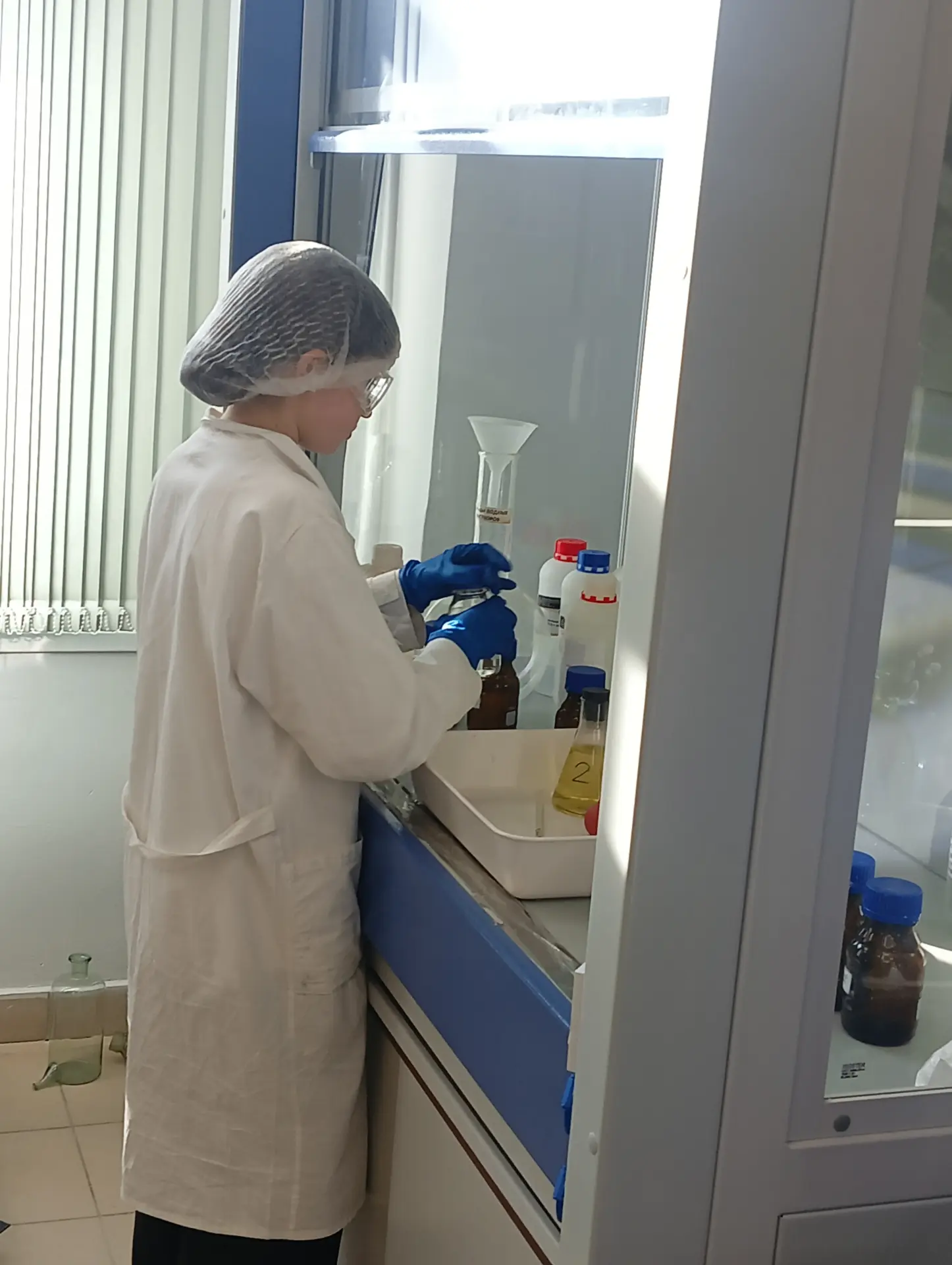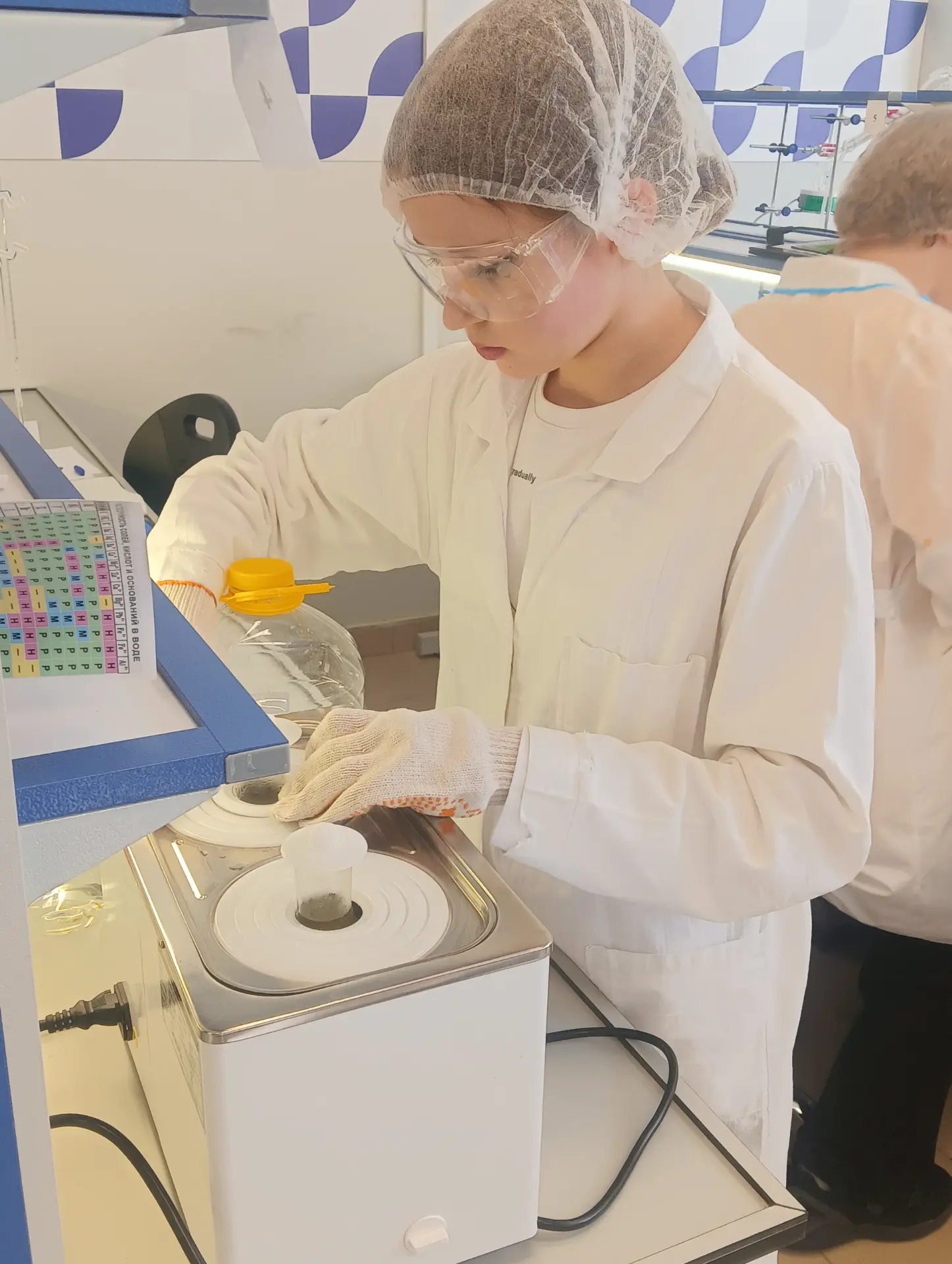 Ученица 8 класса Лапина Ульяна принимает участие в конкурсе в компетенции «Лабораторный химический анализ (юниоры)».