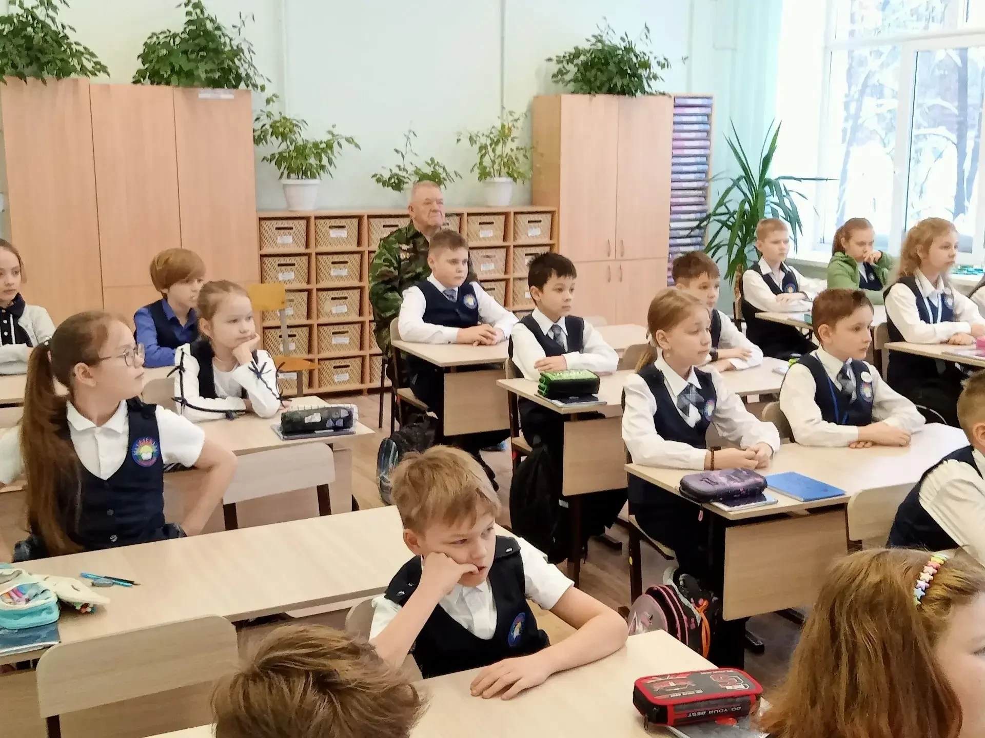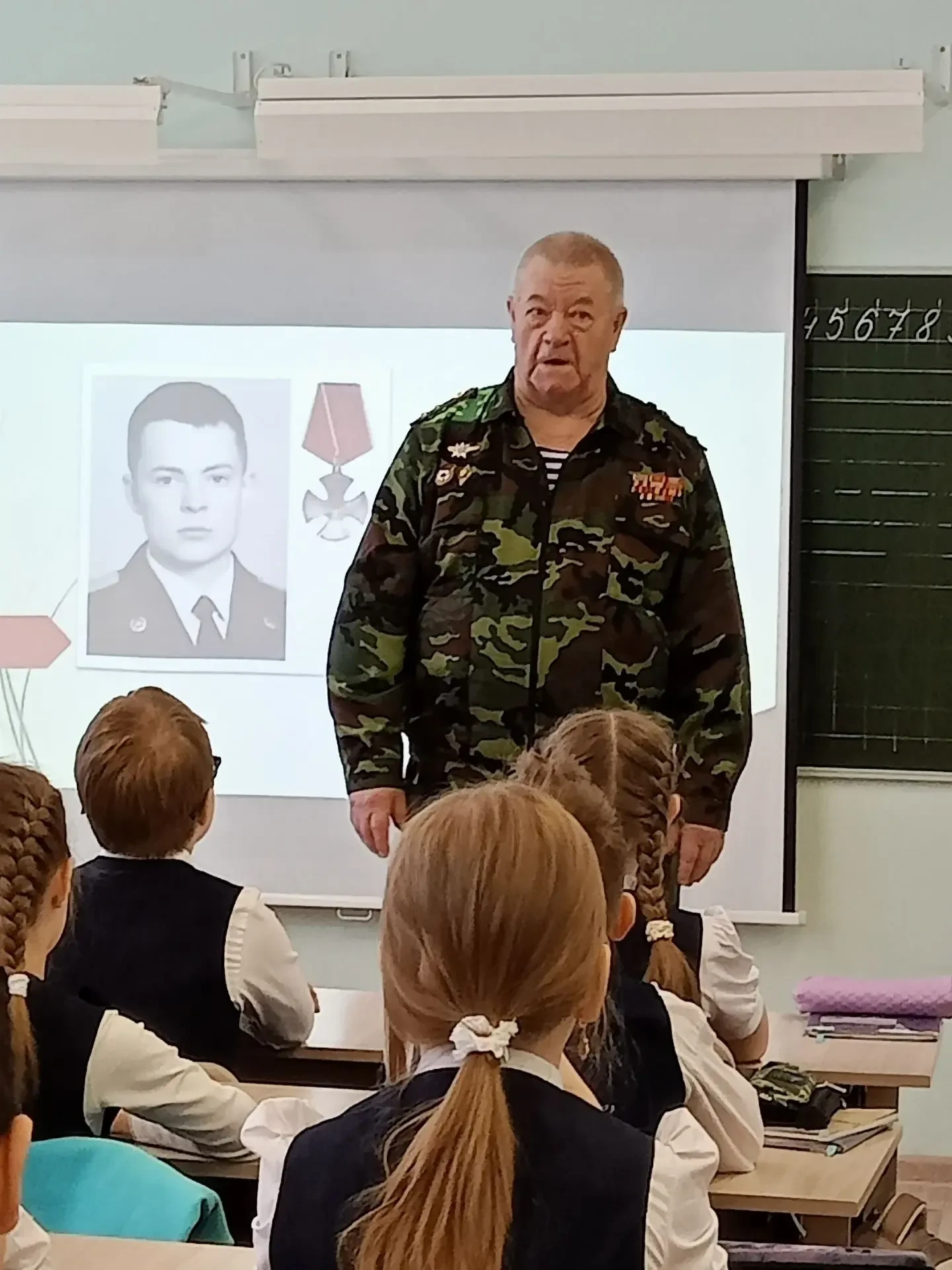 рамках урока «Разговоры о важном» состоялась особая, глубоко трогательная встреча. Учащиеся 3а класса познакомились с полковником Владимиром Николаевичем Баевым — человеком, чья жизнь