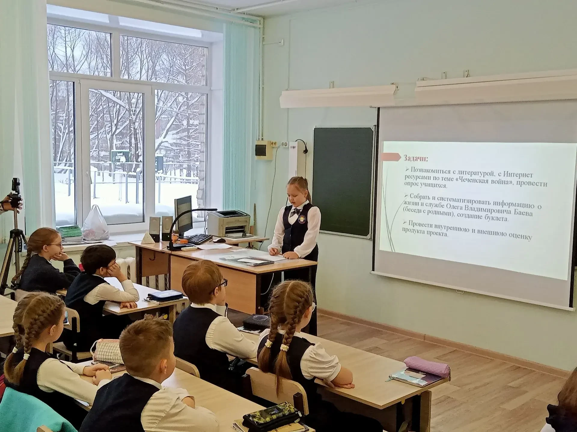 Открыла встречу Полина Владимирова — внучка Владимира Николаевича, ученица нашего класса. Она представила свою проектную работу