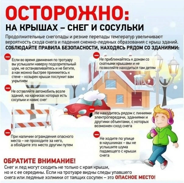 ☝В зимнее время на крышах зданий скапливается большое количество снега и наледи, а также образуются сосульки, которые достигают значительных размеров. Во время оттепели происходит сход снега с крыш зданий и падение сосулек. Находясь в опасной зоне, можно получить от падающего снега и сосулек тяжелые и опасные травмы и даже погибнуть. Чтобы не оказаться в подобной ситуации, следует: