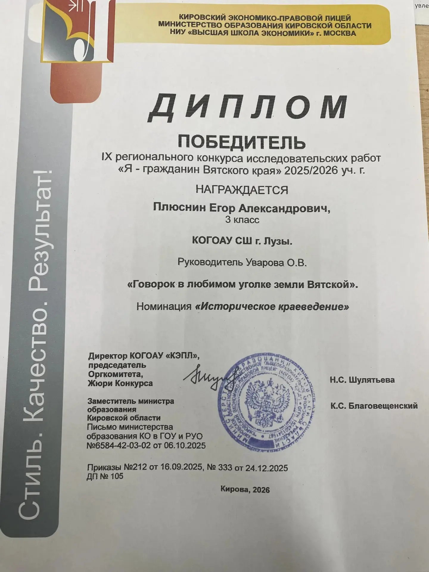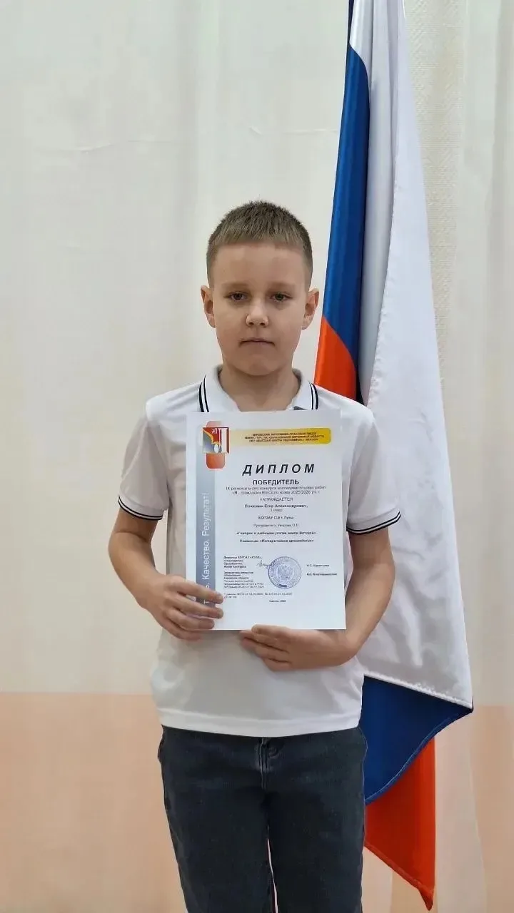 ✨Кировской области - 90 лет!✨🏆 Поздравляем Егора Плюснина, ученика 3-а класса (руководитель Уварова О.В) с победой в IX региональном конкурсе исследовательских работ "Я - гражданин Вятского края" 2025-2026 уч.г.