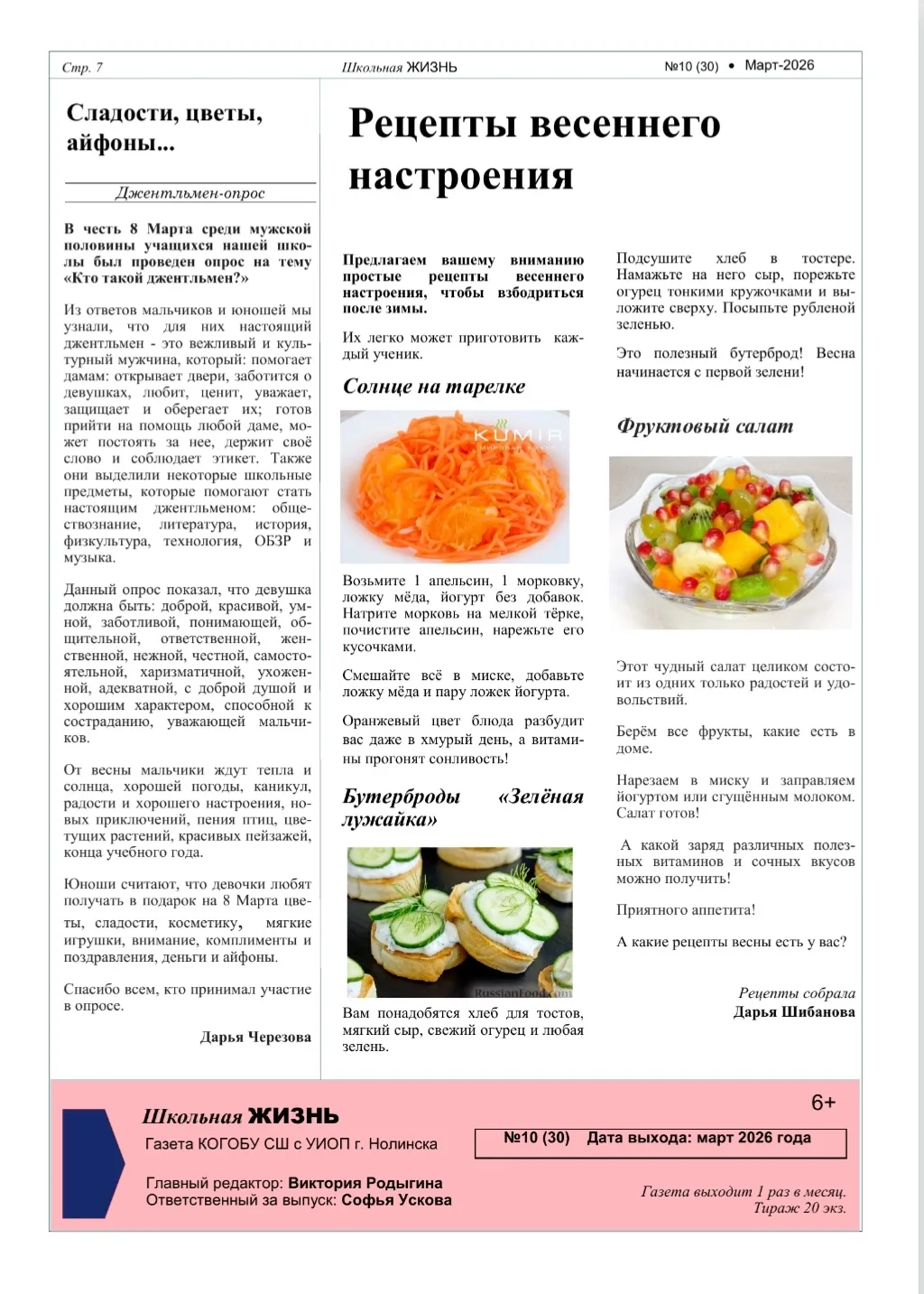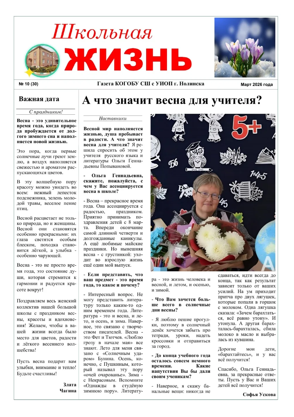 В средней школе города Нолинска состоялось замечательное событие, объединяющее школьников, педагогов и родителей. Классные руководители вместе с учениками организовали празднование Международного женского дня и Дня защитника Отечества, которое получило название «ФевроМарт».