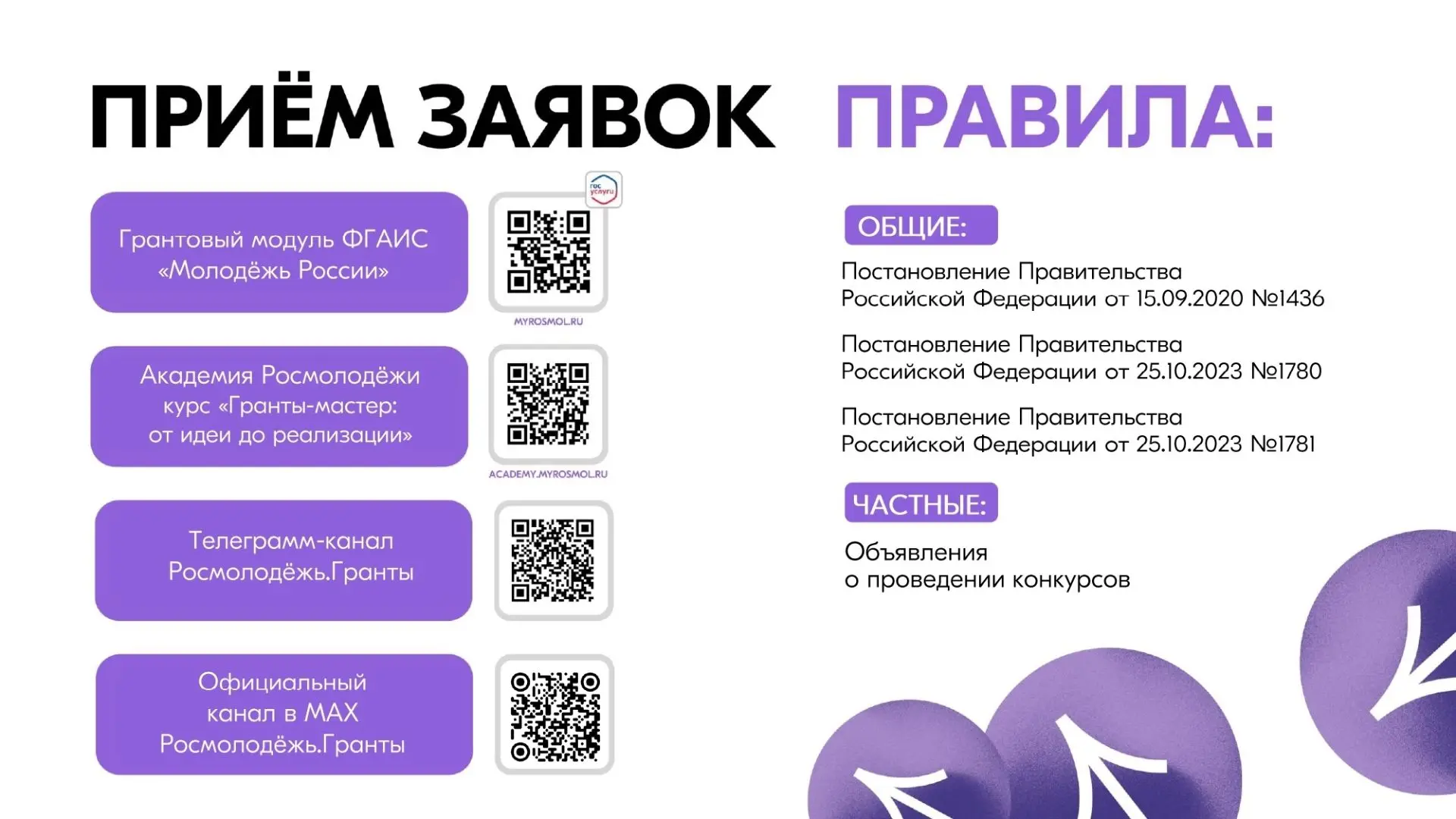 Также есть возможность пройти бесплатное обучение в Академии Росмолодёжи, где доступно пошаговое руководство по подготовке грантовой заявки и достижению запланированных результатов.
