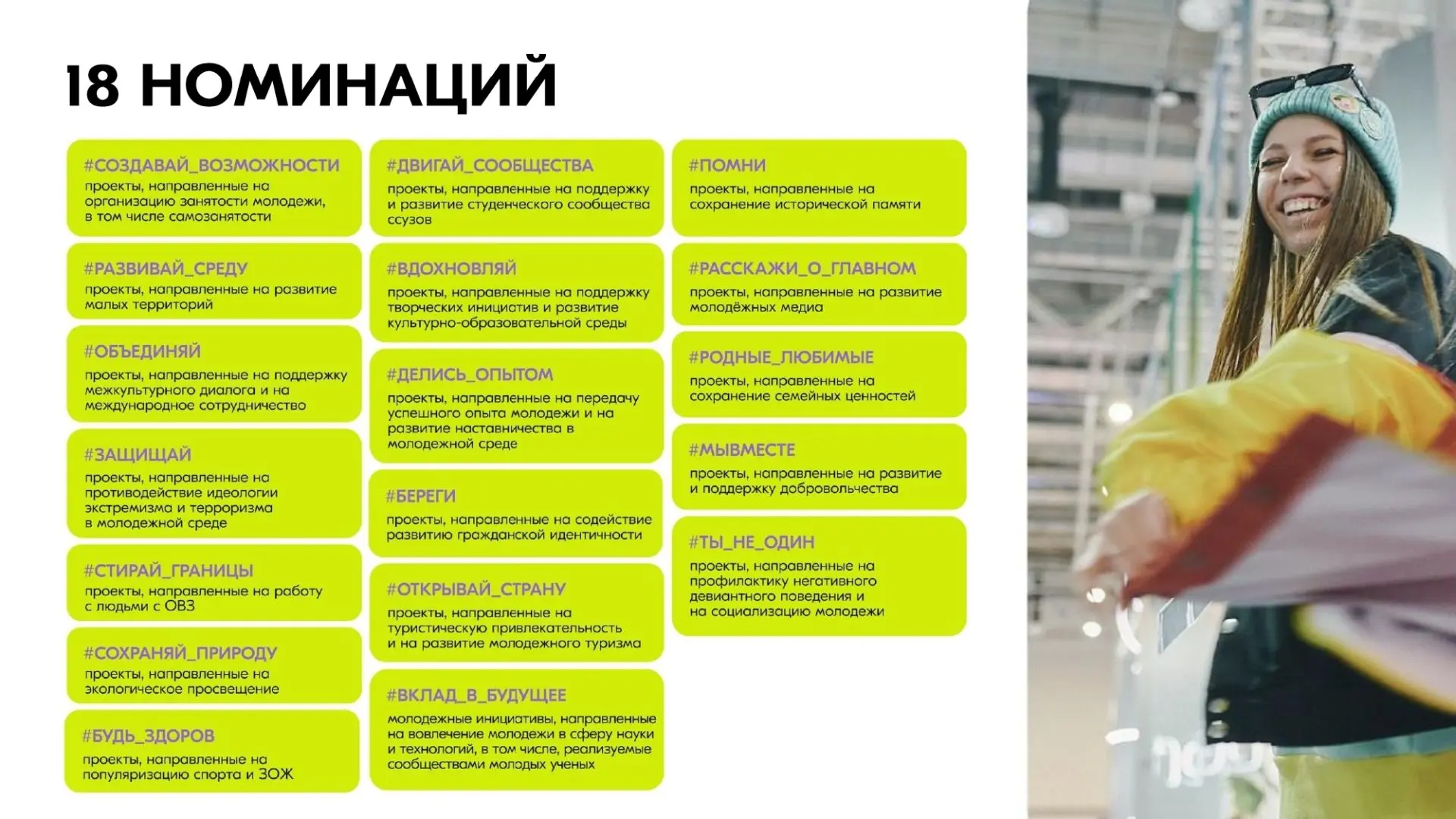 Всего в конкурсе 18 тематических номинаций – от науки и технологий до творческих и патриотических инициатив.