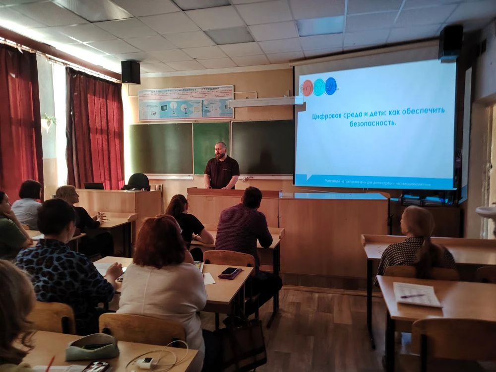 Для педагогов школы прошла учёба по профилактике. С учителями провели беседы сотрудники УМВД, "Центра по противодействию экстремизму МВД" , а также специалист "Центра информационной безопасности", которые рассказали о кибербезопасности взрослых и подростков, о маркерах деструктива .