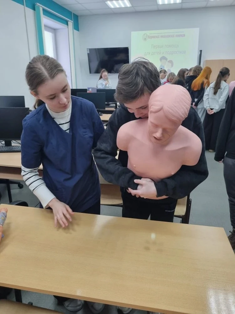 Сегодня учащиеся 8х классов в рамках профориентационной работы посетили Кировский медицинский колледж. Учащиеся побывали на занятии по оказанию первой медицинской помощи. Курс состоит из 2 частей: теории и практики. По итогу обучения ребята получили сертификаты.
